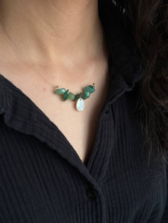 گردنبند زنانه سنگ طبیعی اونتورین سبز با پلاک صدف طبیعی و نخ نامرئی مدل بهشت