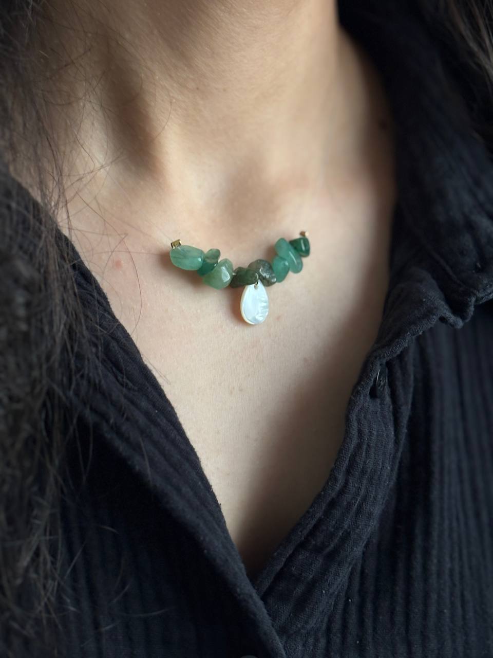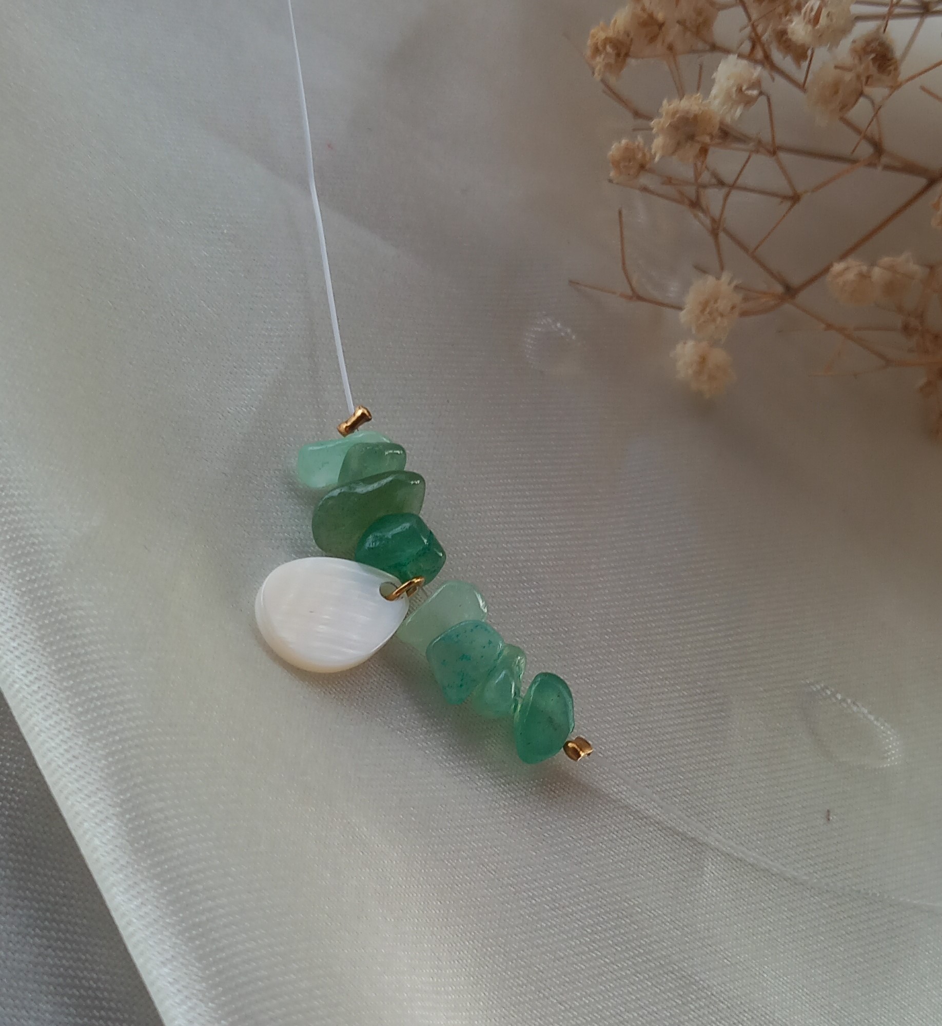 گردنبند زنانه سنگ طبیعی اونتورین سبز با پلاک صدف طبیعی و نخ نامرئی مدل بهشت
