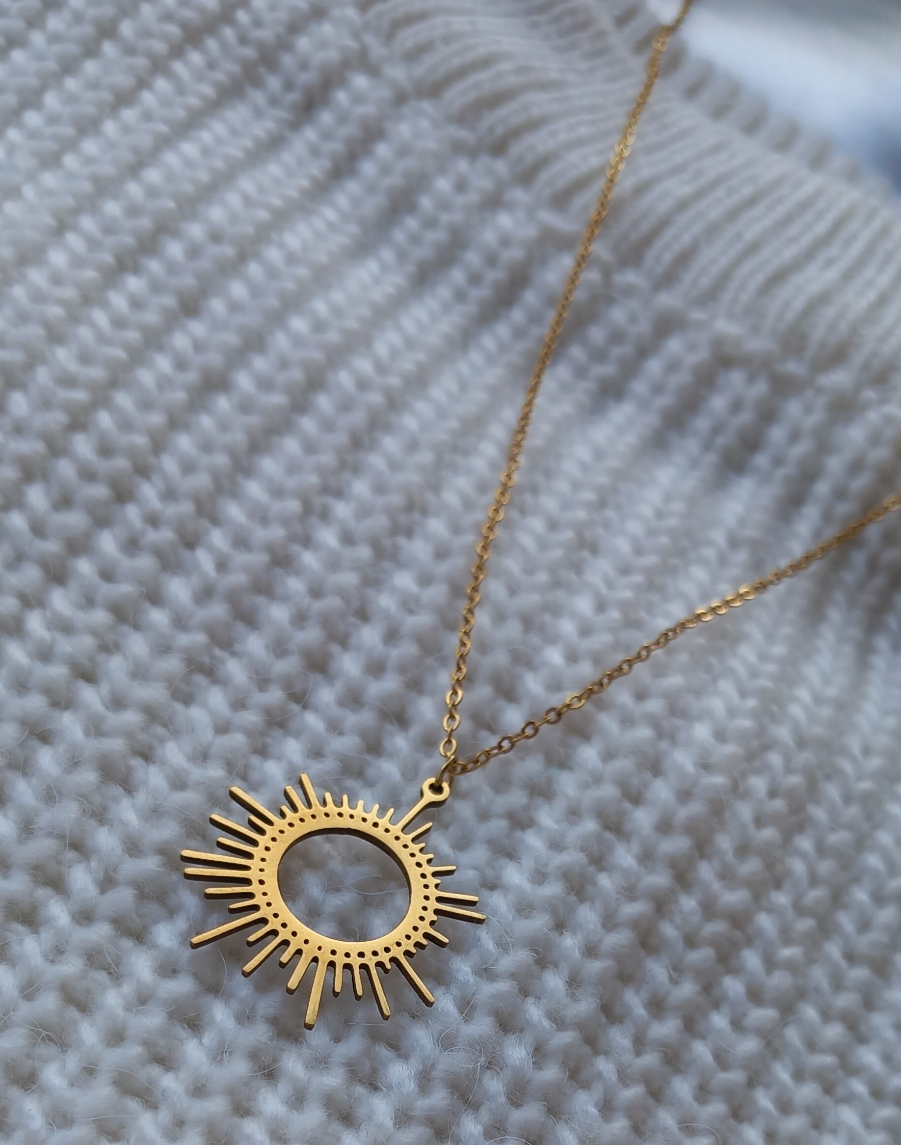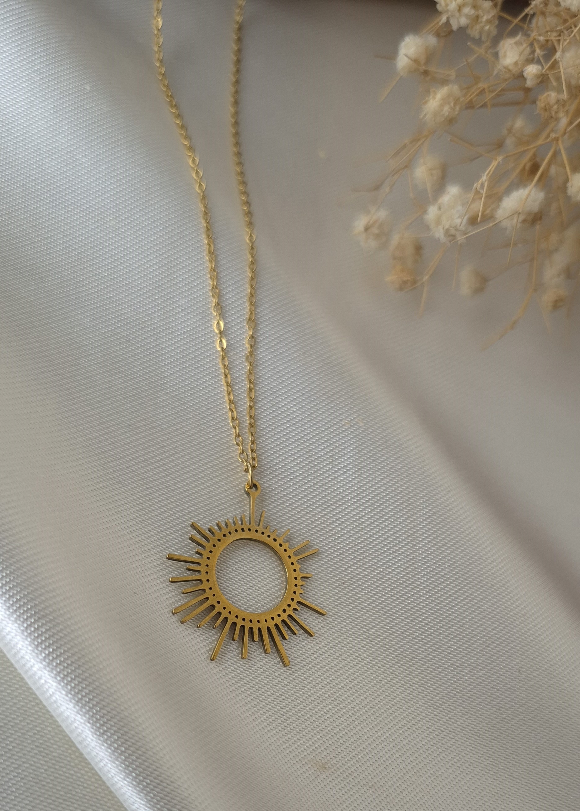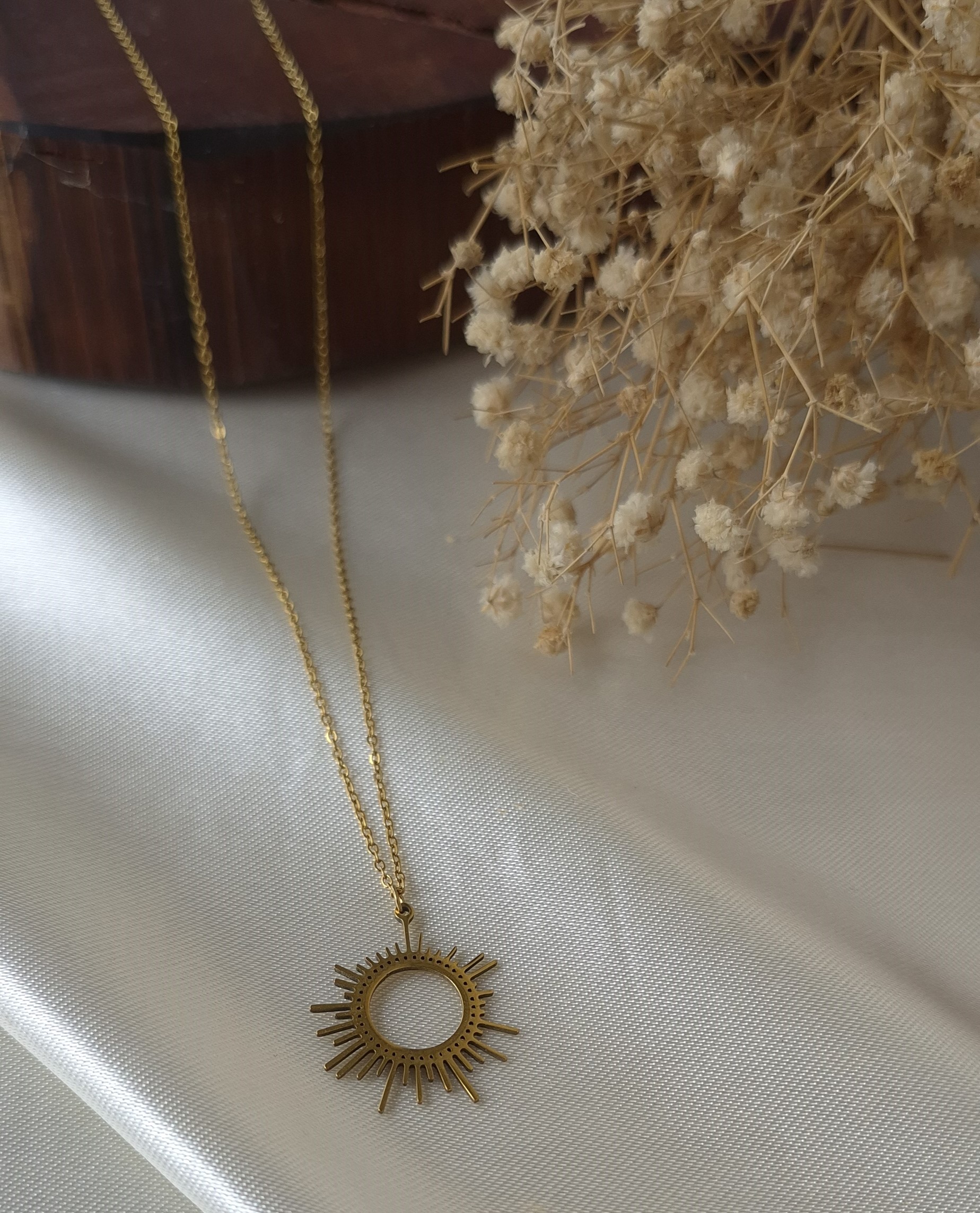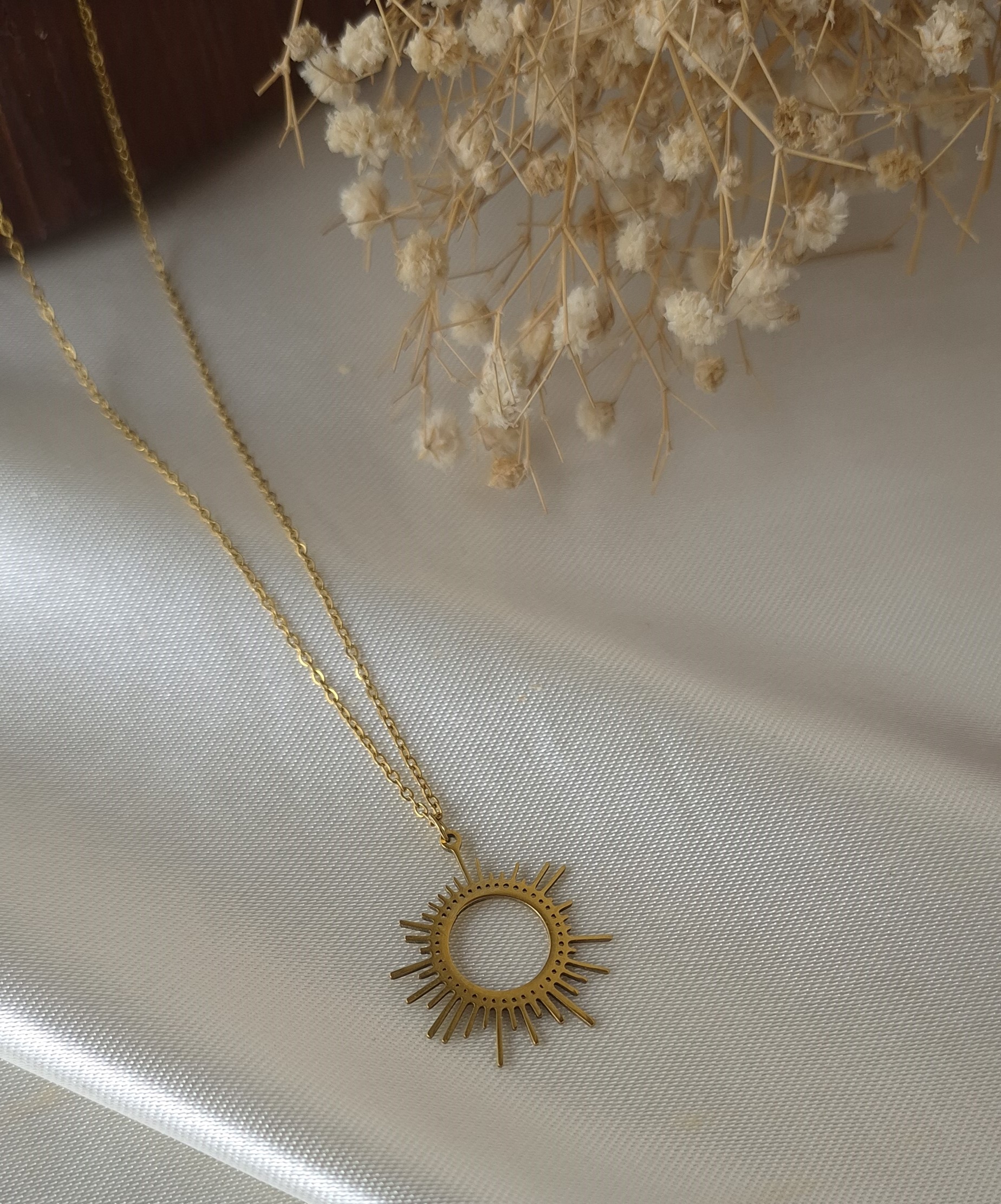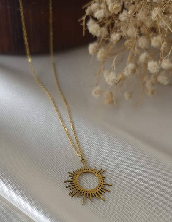 گردنبند زنانه استیل طلایی رنگ ثابت مدل خورشید، انتخابی شیک و فانتزی برای تکمیل استایل روزمره و مهمانیها است. طراحی ظریف پلاک خورشید با جزئیات زیبا، جلوهای لوکس و درخشان به گردنبند میبخشد.