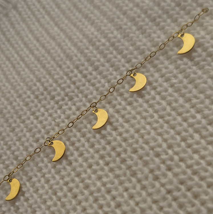 پولکهای ماه که روی زنجیر قرار گرفتهاند، با هر حرکت دست برق میزنند و استایلت را چشمگیر و متفاوت میکنند. درخشش طلایی آن کاملاً مشابه طلاست و بهراحتی با هر استایل روزانه، مهمانی و حتی استایلهای مینیمال قابل ست کردن است.