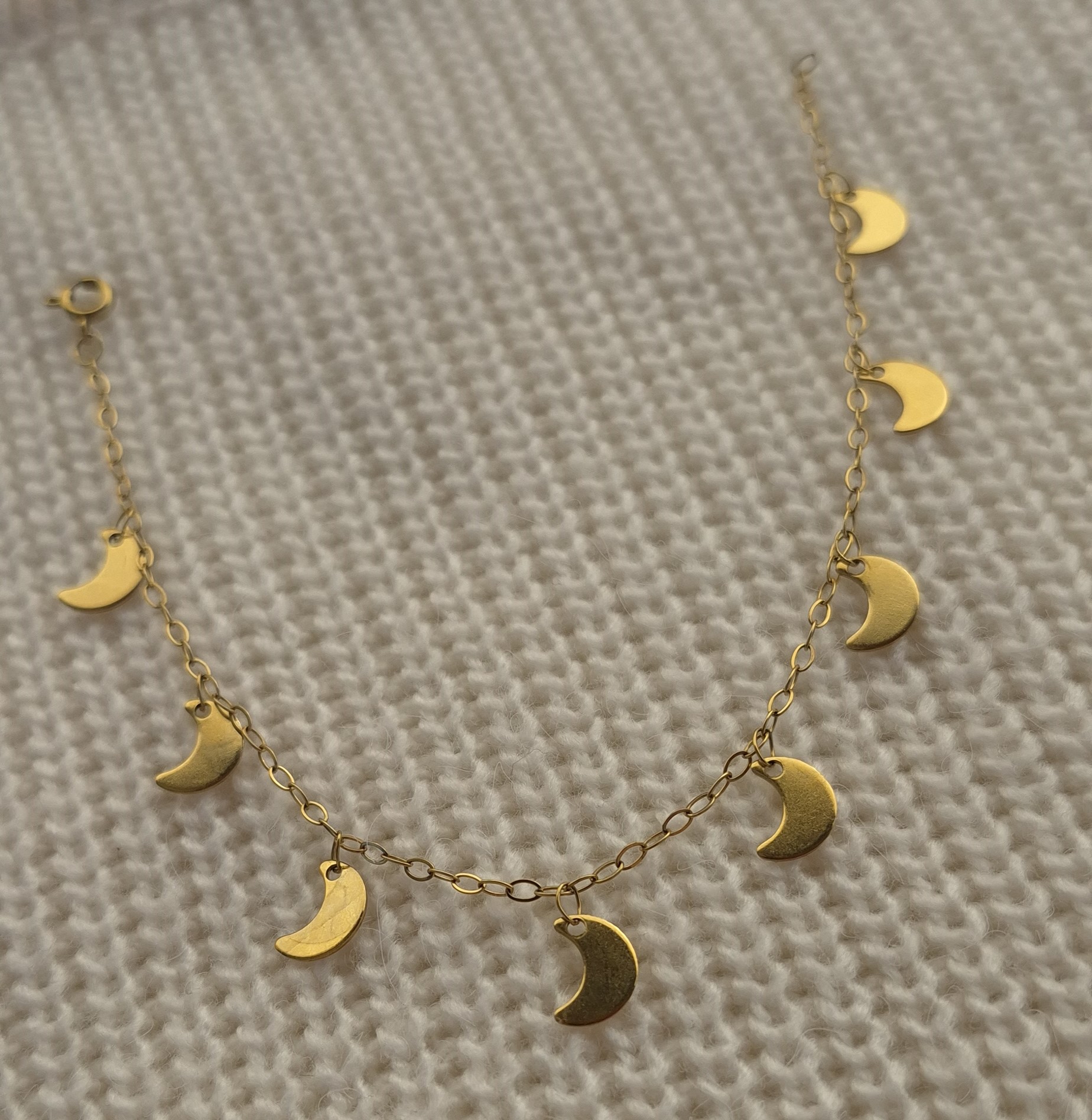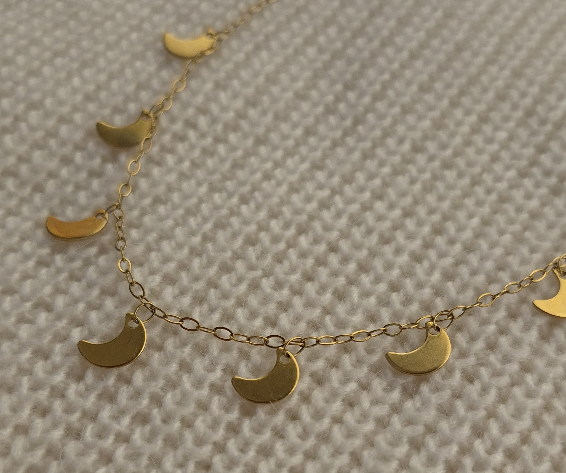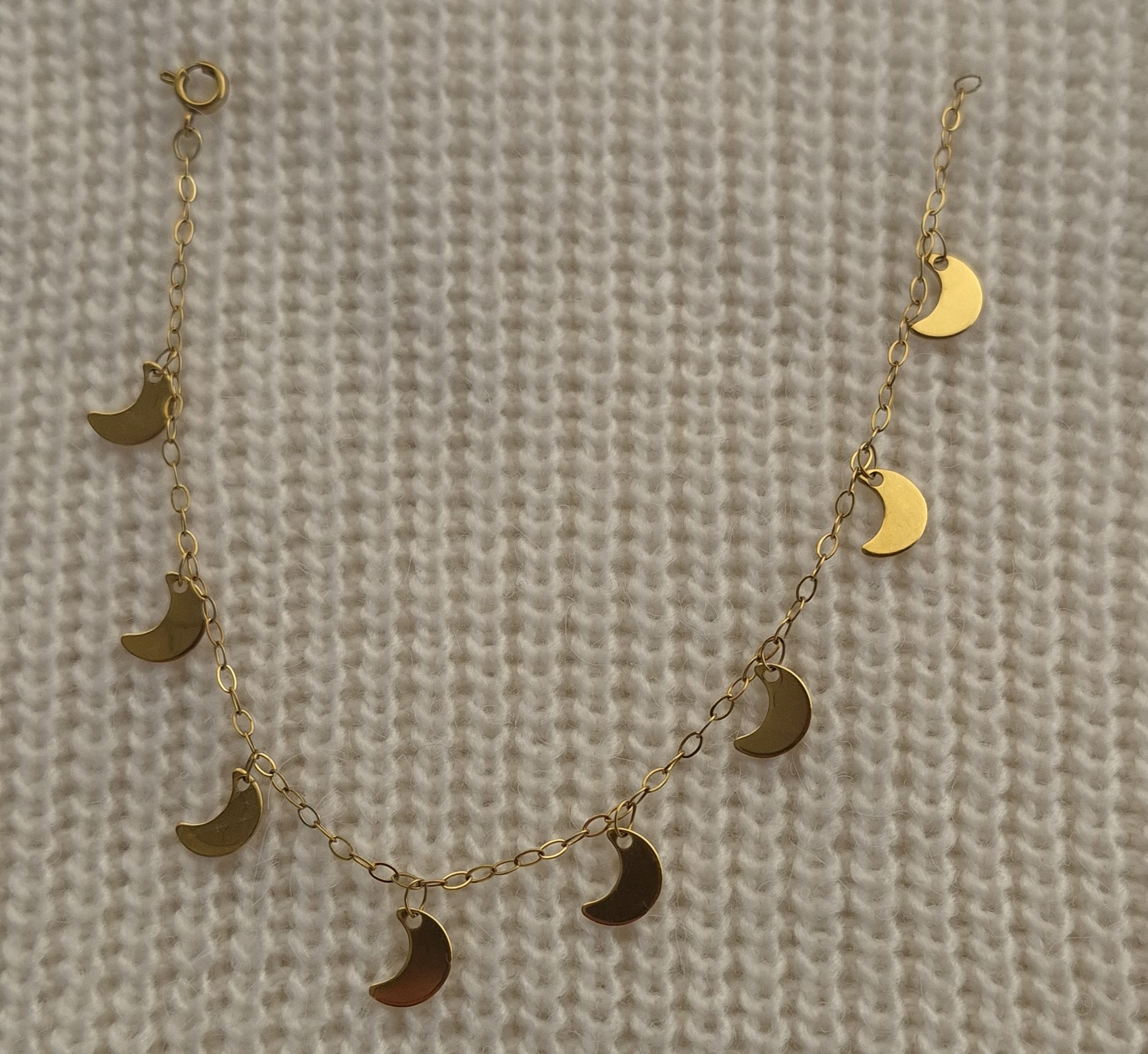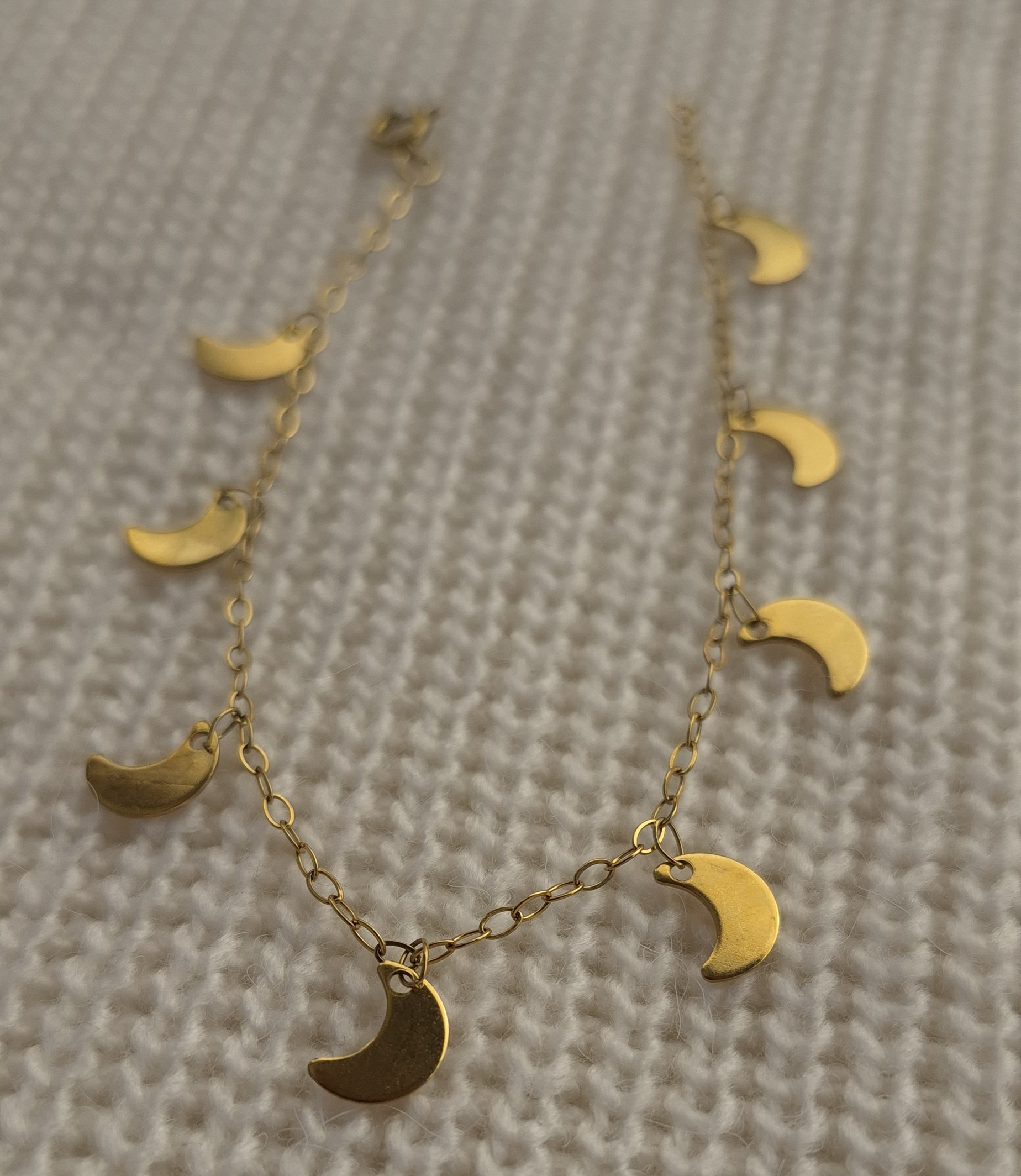 پولکهای ماه که روی زنجیر قرار گرفتهاند، با هر حرکت دست برق میزنند و استایلت را چشمگیر و متفاوت میکنند. درخشش طلایی آن کاملاً مشابه طلاست و بهراحتی با هر استایل روزانه، مهمانی و حتی استایلهای مینیمال قابل ست کردن است.