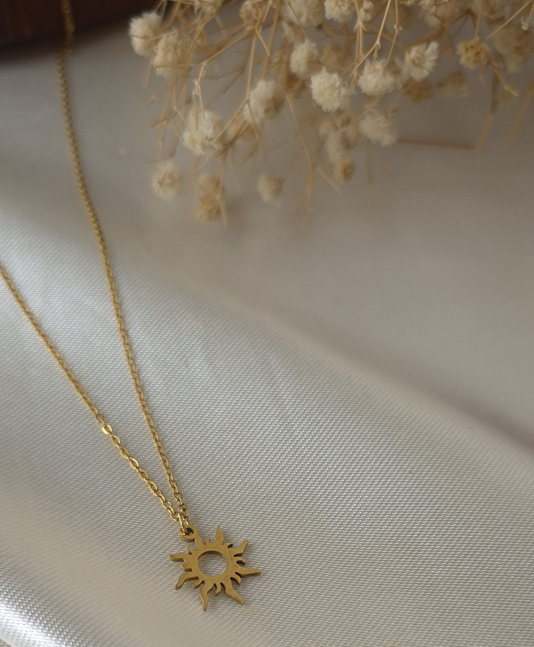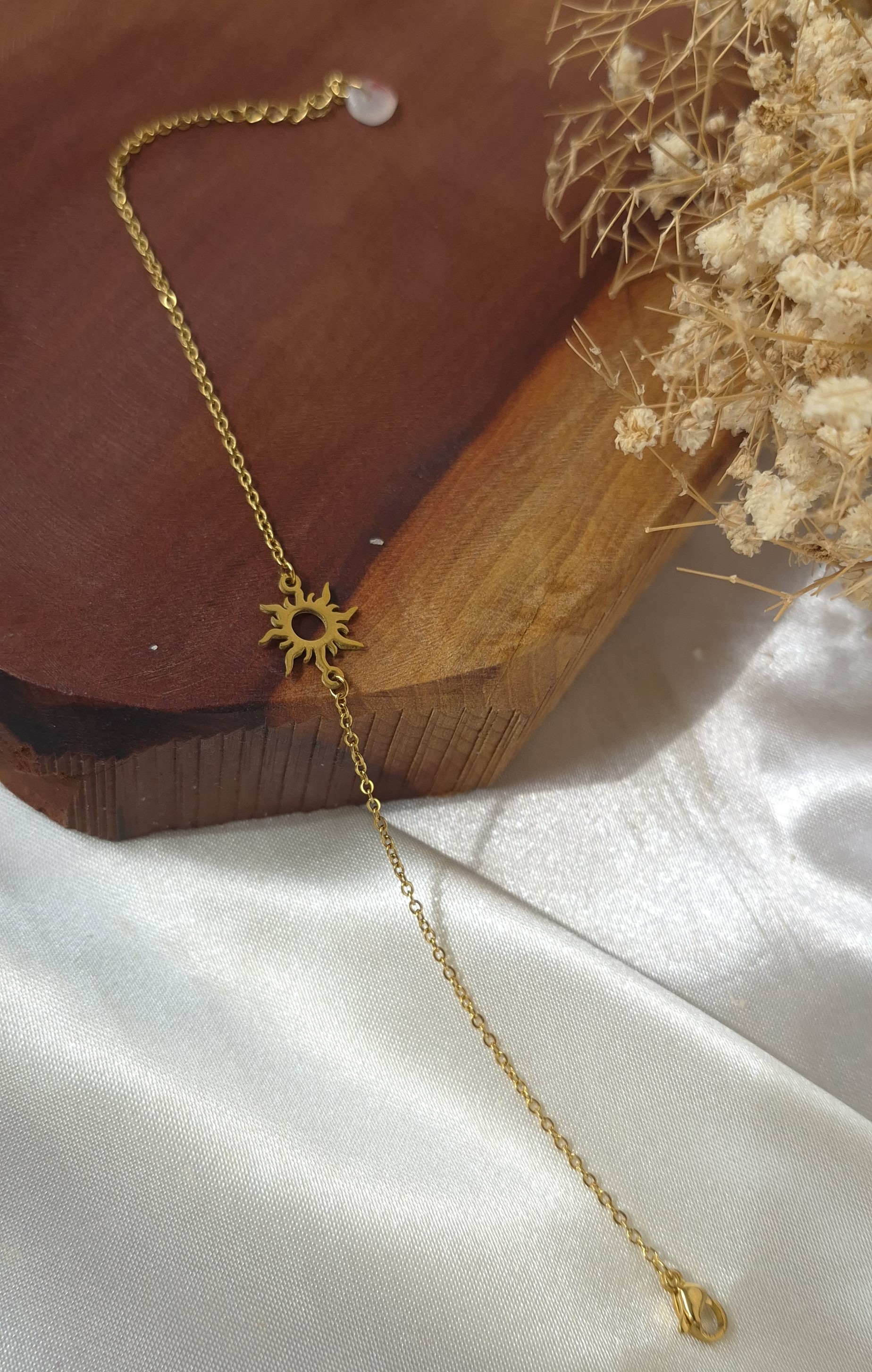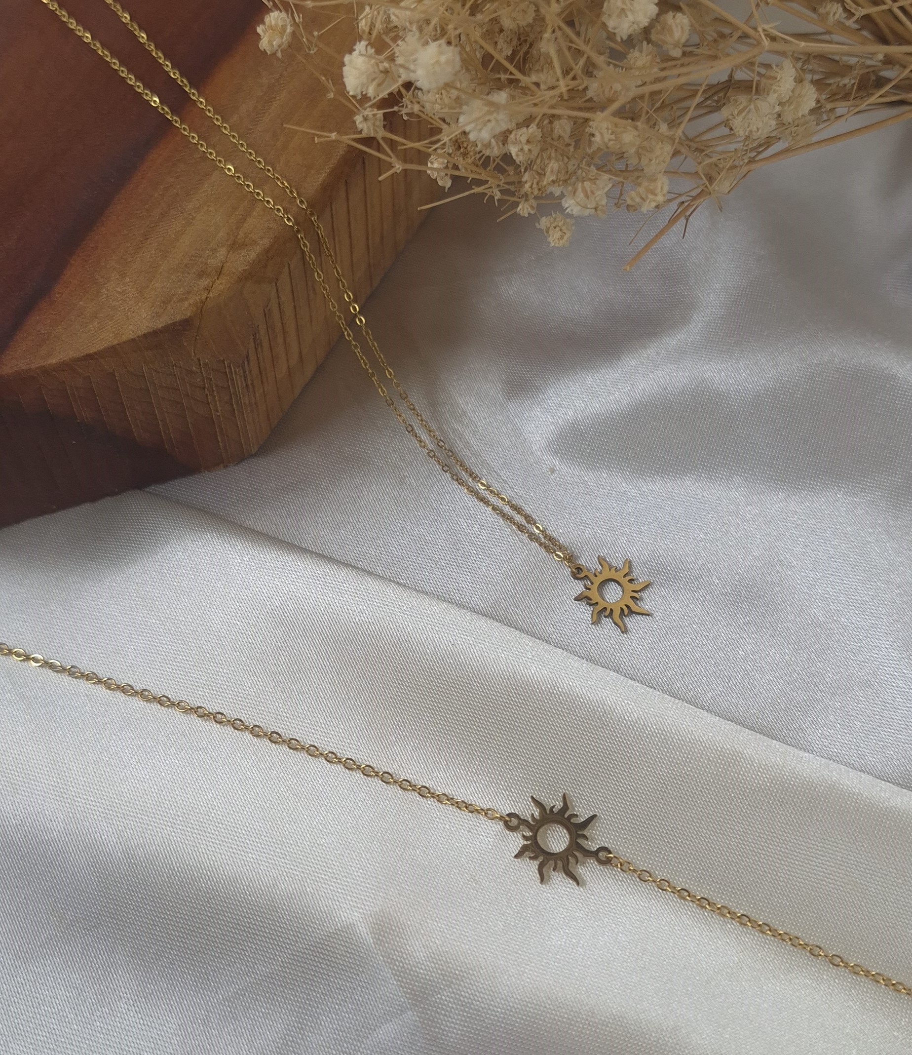 ست دستبند و گردنبند زنانه استیل طلایی با طراحی ظریف و درخشان مدل خورشید تابان، جلوهای شیک و چشمگیر به استایل شما میبخشد. طراحی مینیمال و ظریف این مدل با پلاکی به طول ۱ سانتیمتر باعث شده این ست حالتی لطیف، دخترانه و بسیار شیک داشته باشد و کاملاً مشابه طلا دیده شود.