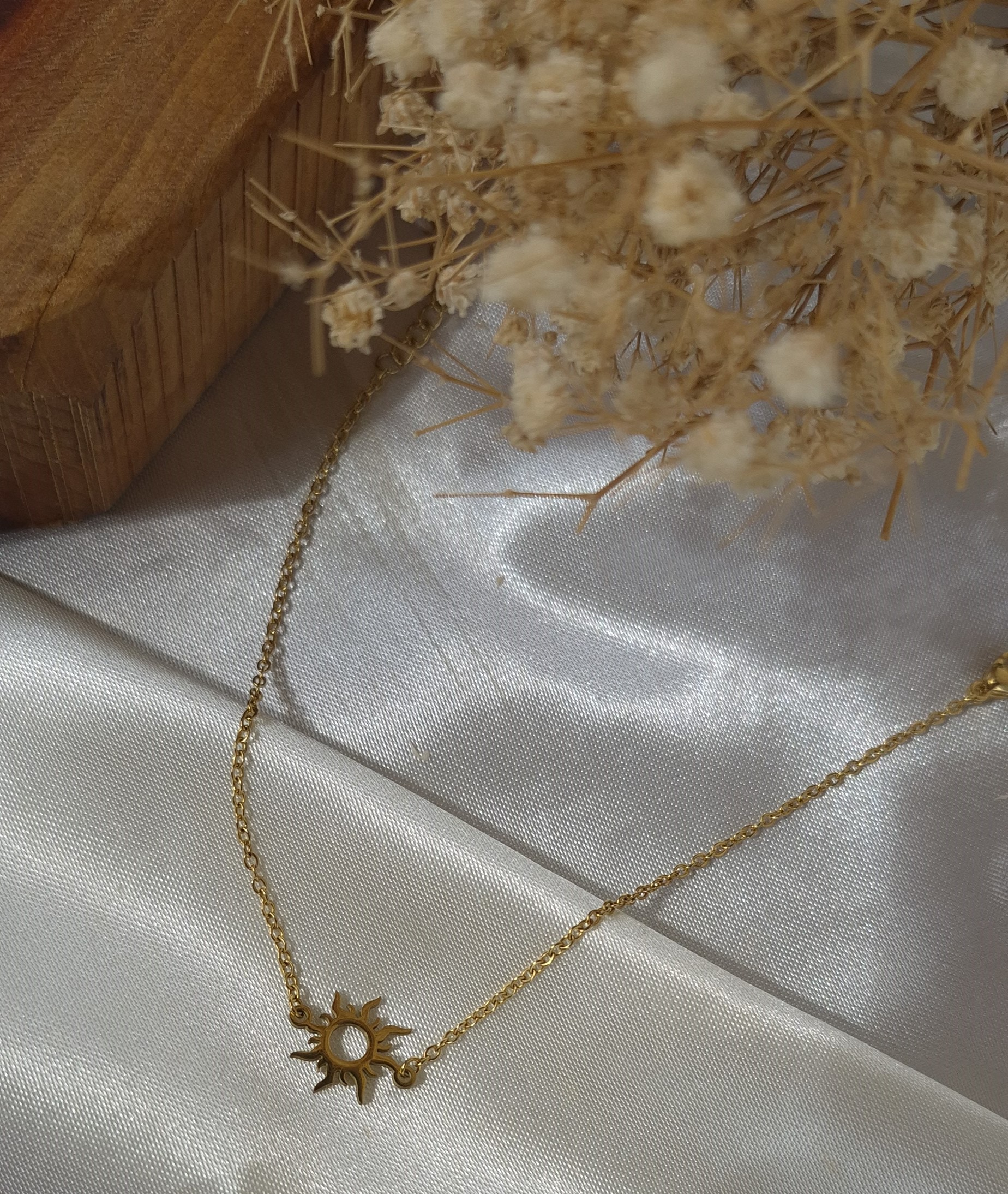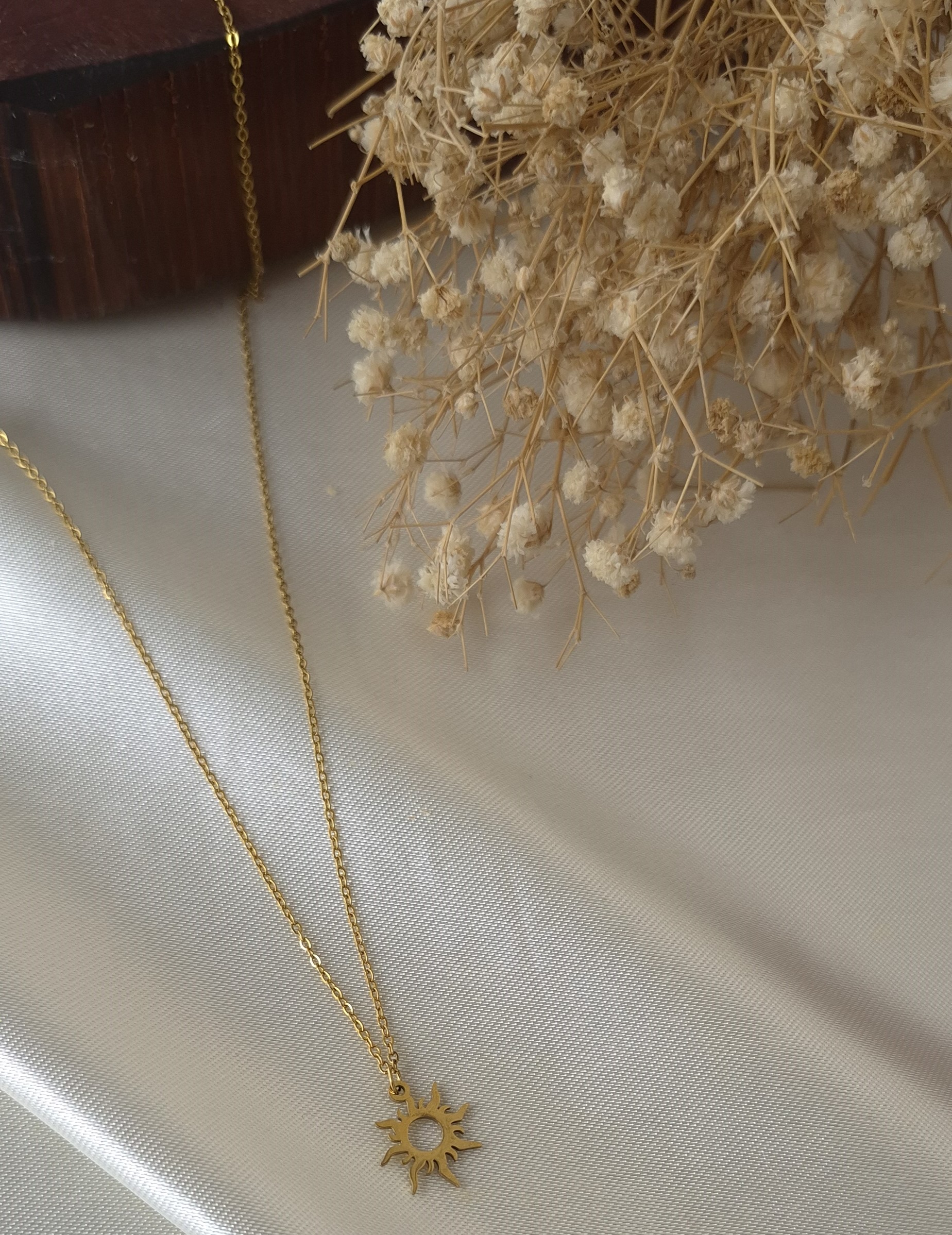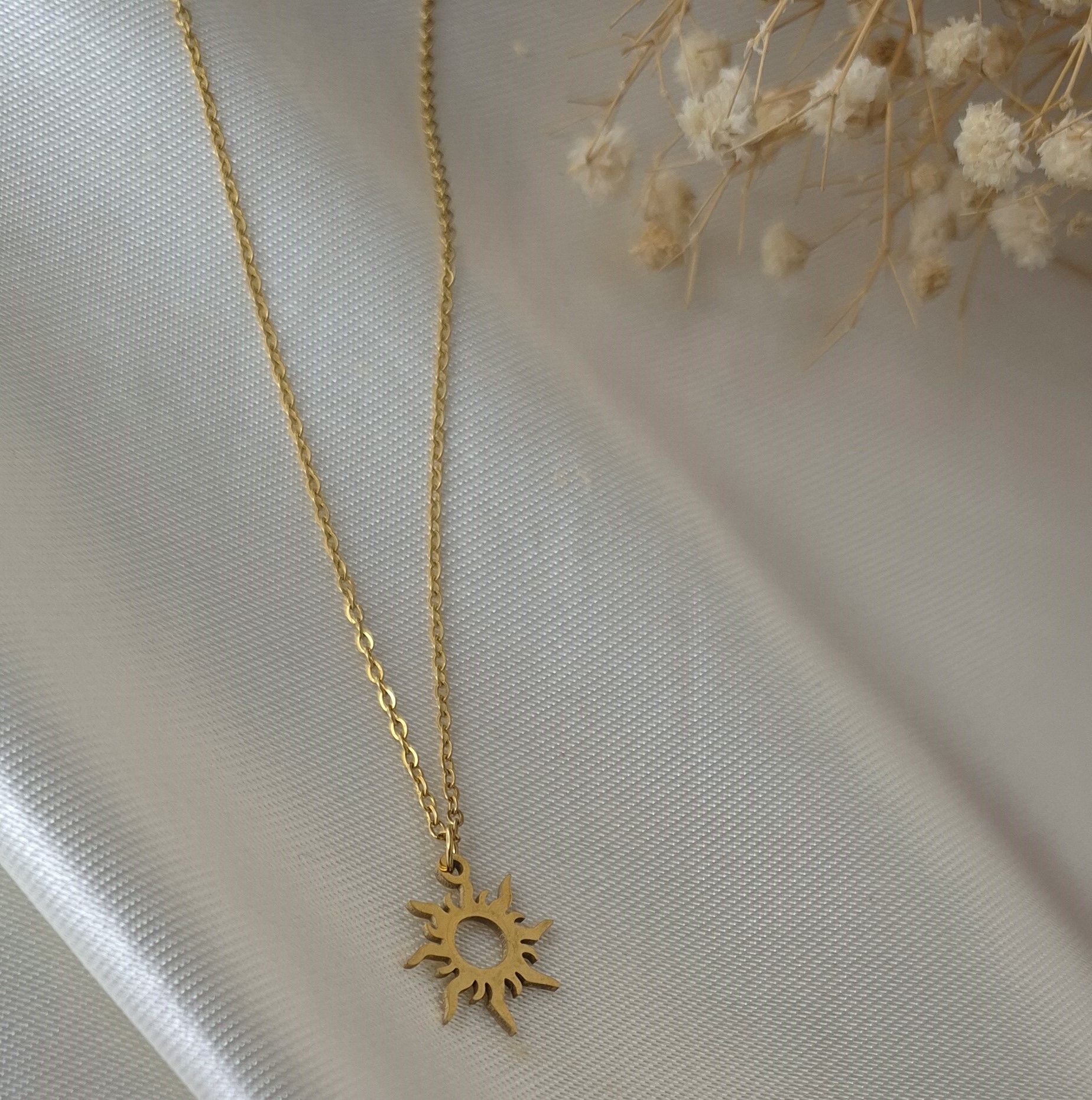 ست دستبند و گردنبند زنانه استیل طلایی با طراحی ظریف و درخشان مدل خورشید تابان، جلوهای شیک و چشمگیر به استایل شما میبخشد. طراحی مینیمال و ظریف این مدل با پلاکی به طول ۱ سانتیمتر باعث شده این ست حالتی لطیف، دخترانه و بسیار شیک داشته باشد و کاملاً مشابه طلا دیده شود.