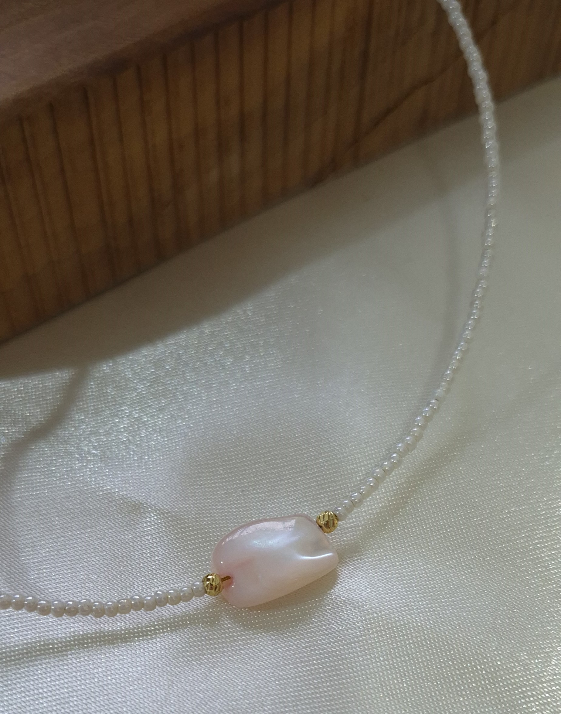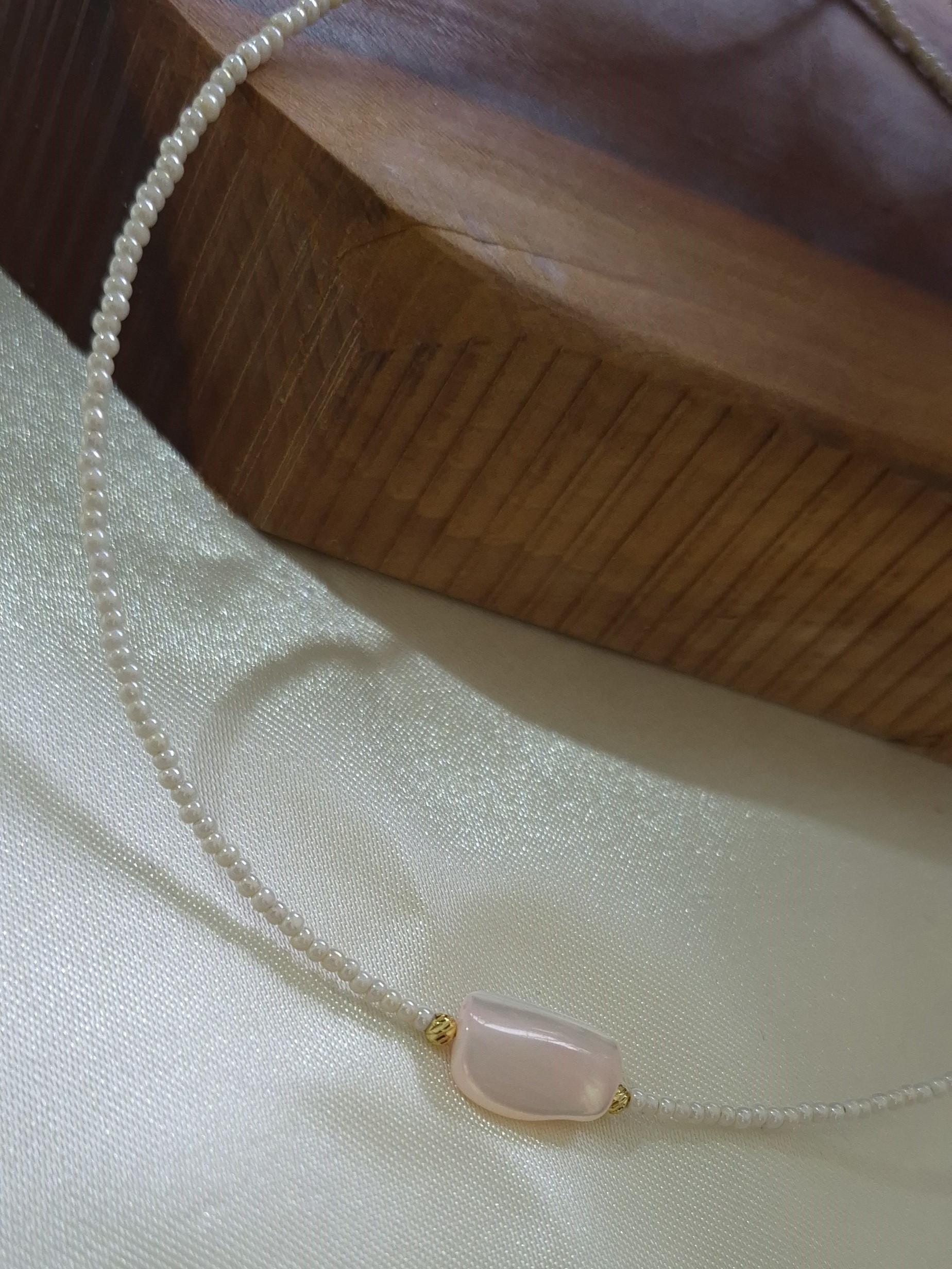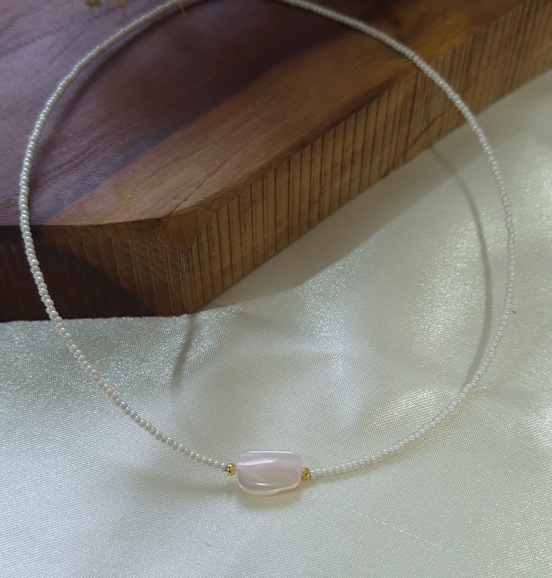 این گردنبند زنانه با ترکیب لطیف و چشمنواز مروارید ترمه سفید و پلاک خاص صدف طبیعی صورتی ملایم، جلوهای بسیار ظریف، دخترانه و شیک به استایل شما میبخشد. رنگ صورتی صدف بهصورت ملایم و چشمنواز طراحی شده که حس لطافت و آرامش را به استایل شما اضافه میکند.