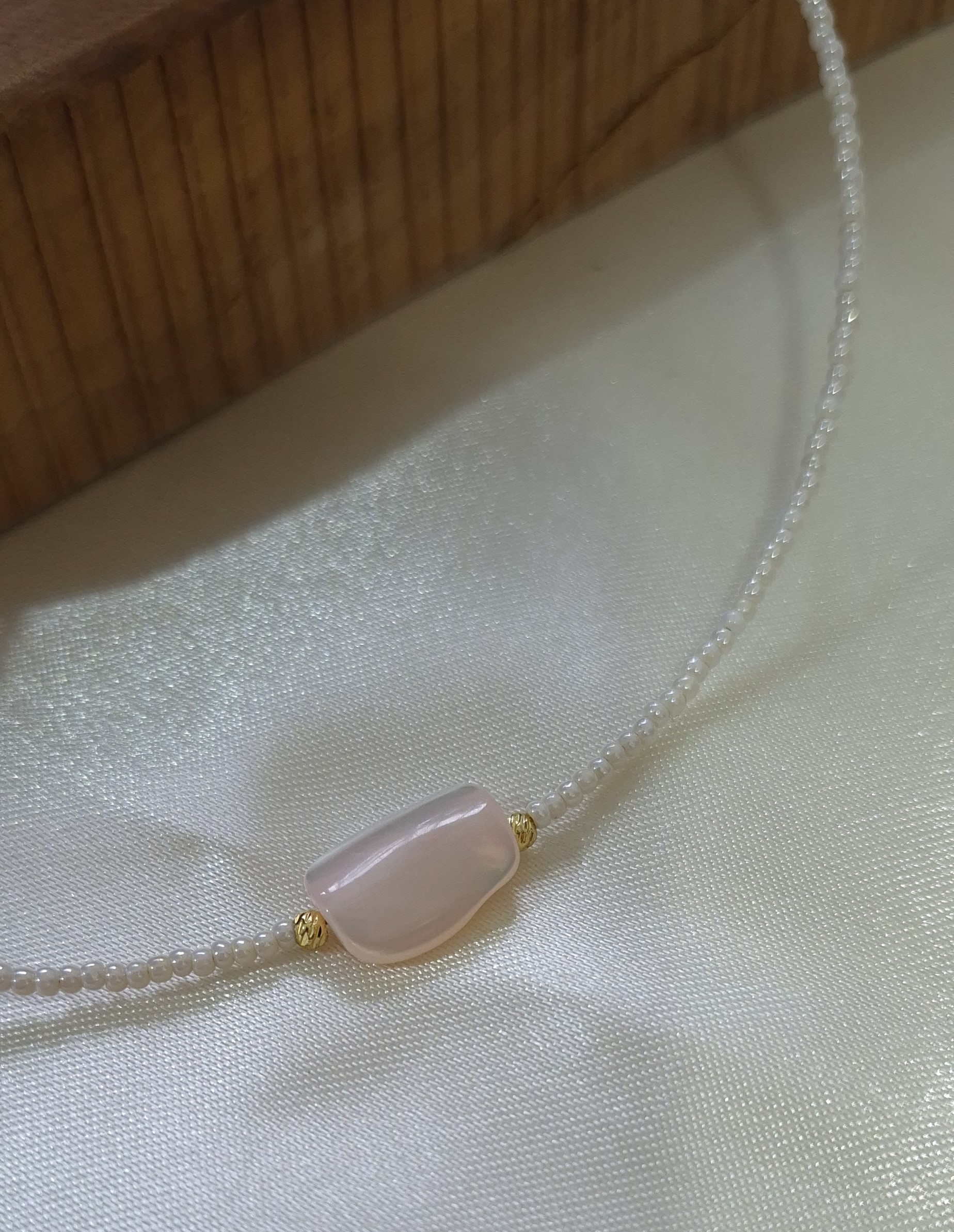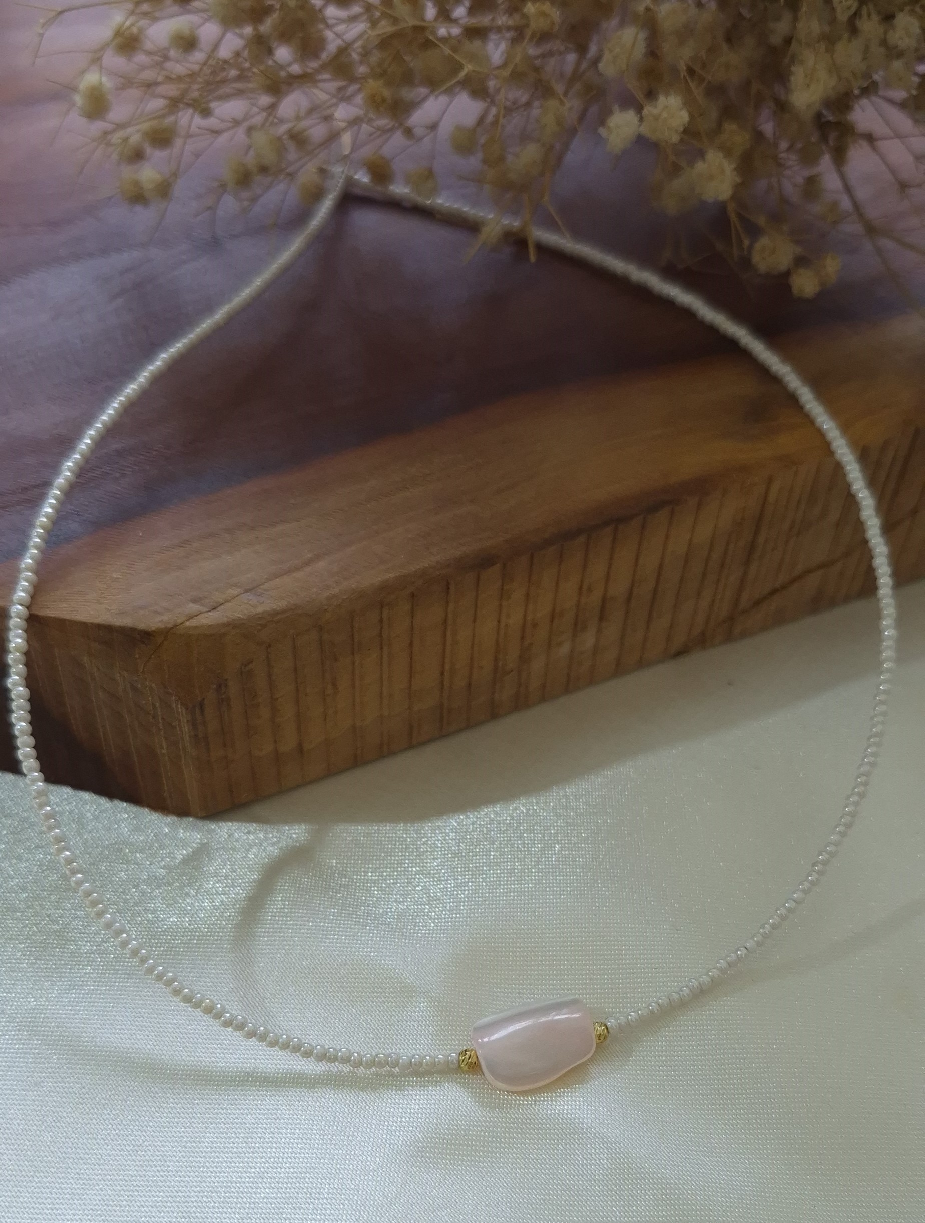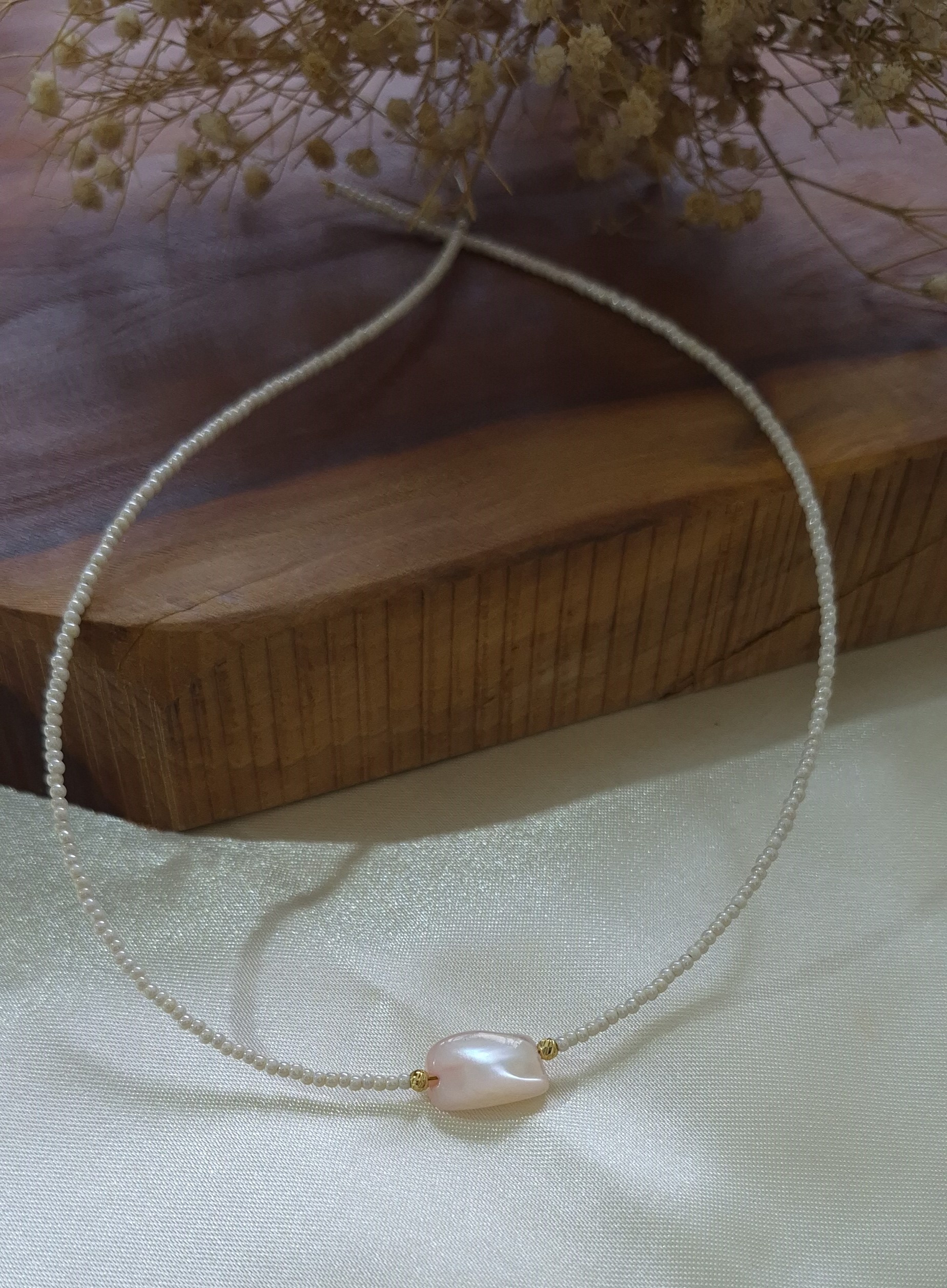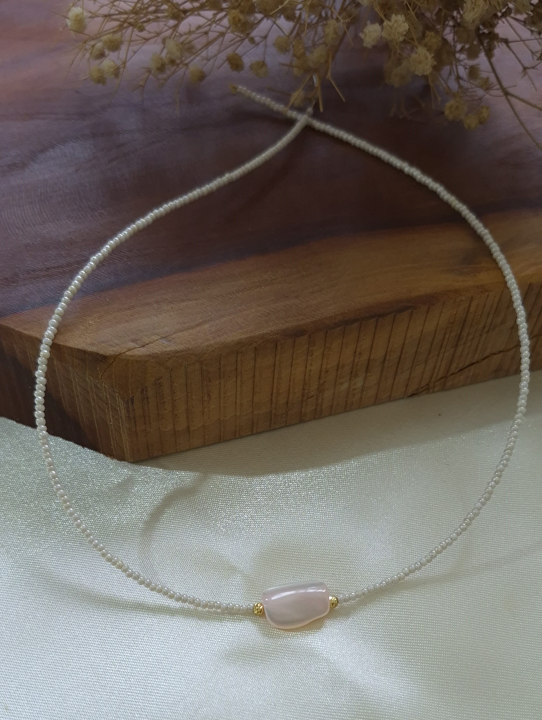 این گردنبند زنانه با ترکیب لطیف و چشمنواز مروارید ترمه سفید و پلاک خاص صدف طبیعی صورتی ملایم، جلوهای بسیار ظریف، دخترانه و شیک به استایل شما میبخشد. رنگ صورتی صدف بهصورت ملایم و چشمنواز طراحی شده که حس لطافت و آرامش را به استایل شما اضافه میکند.