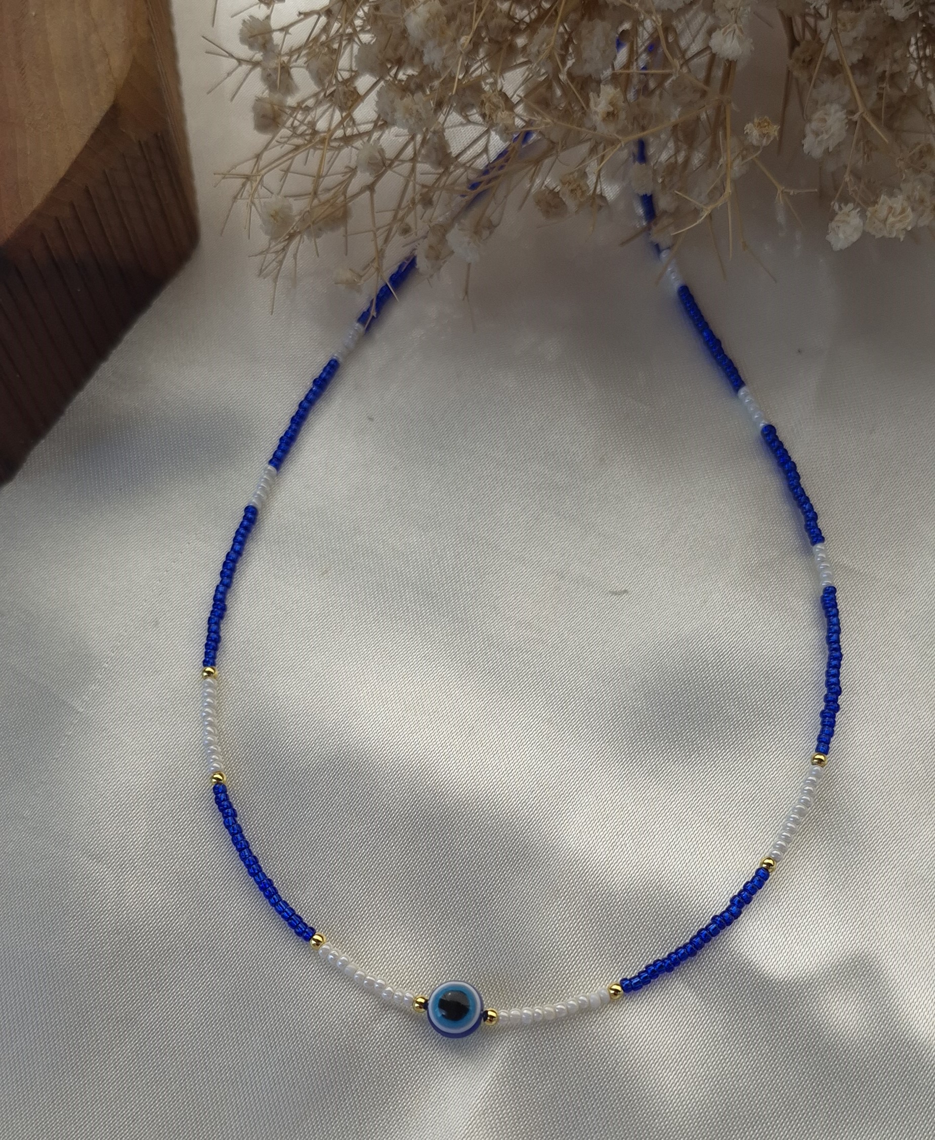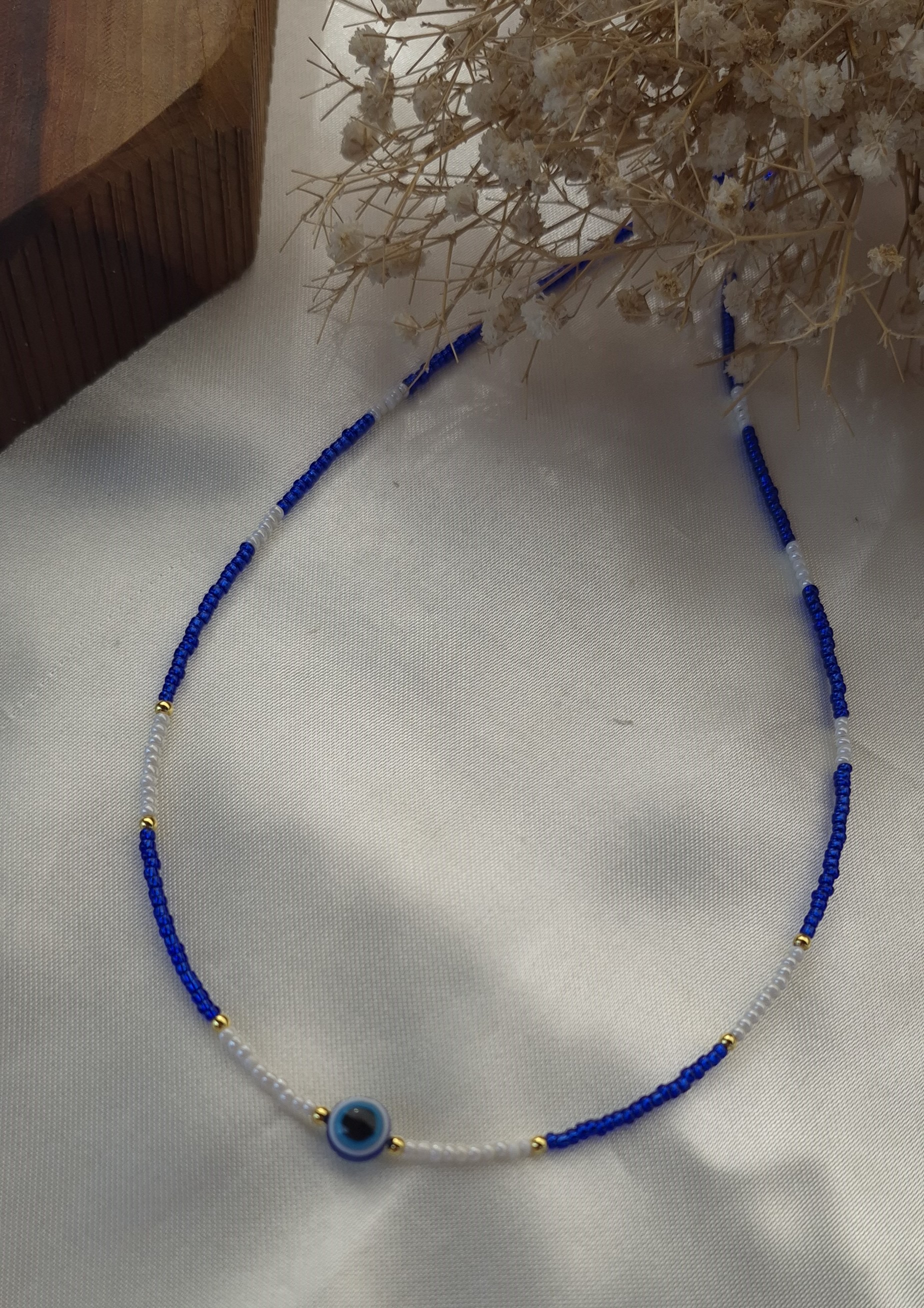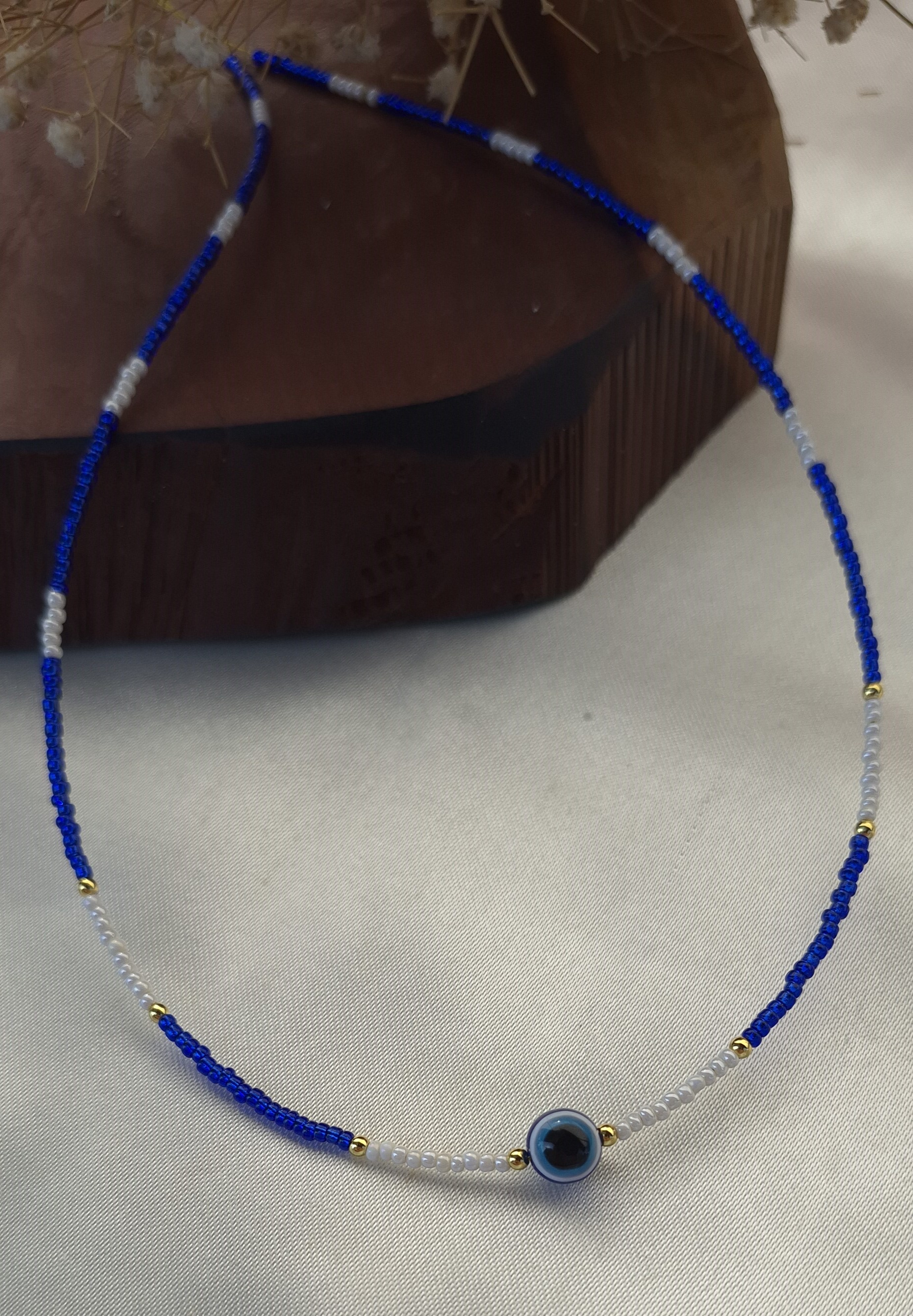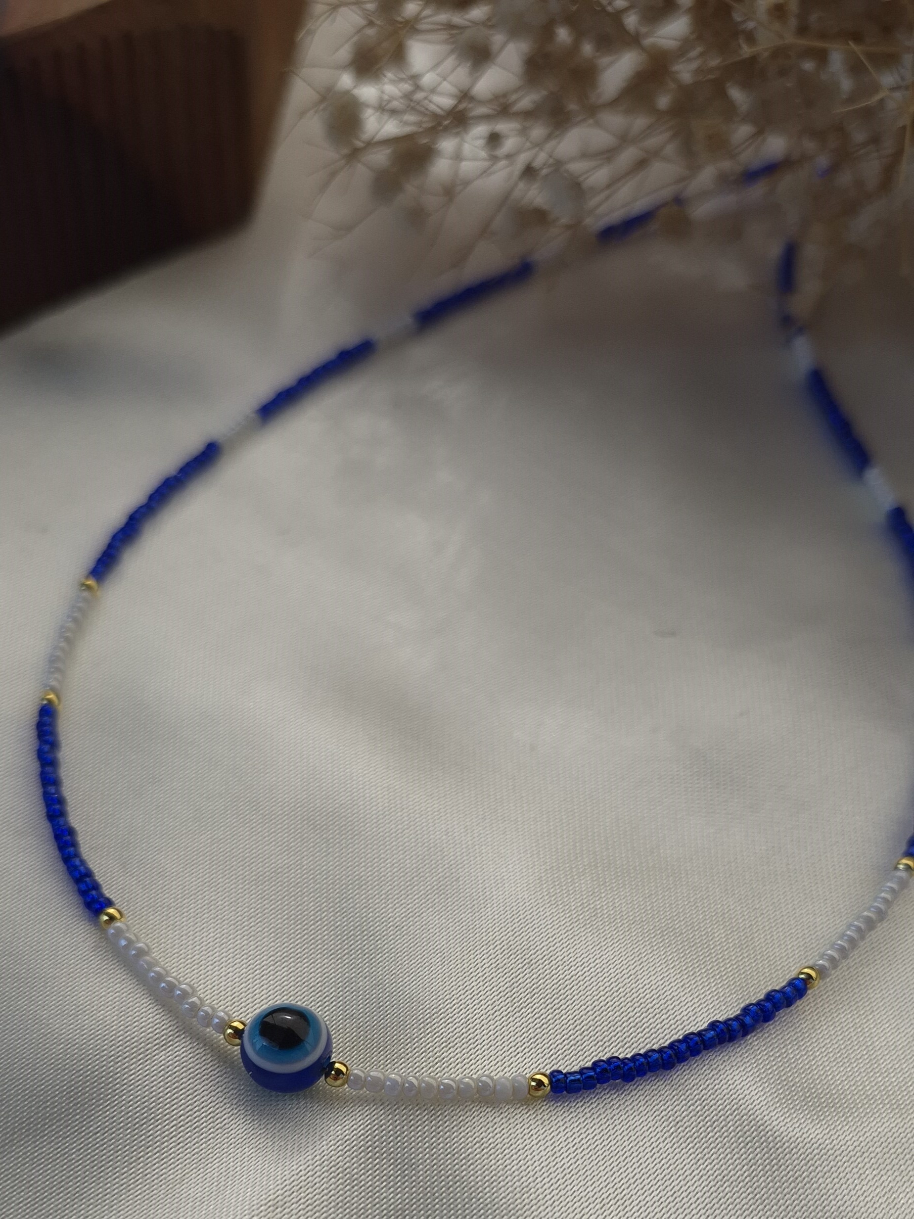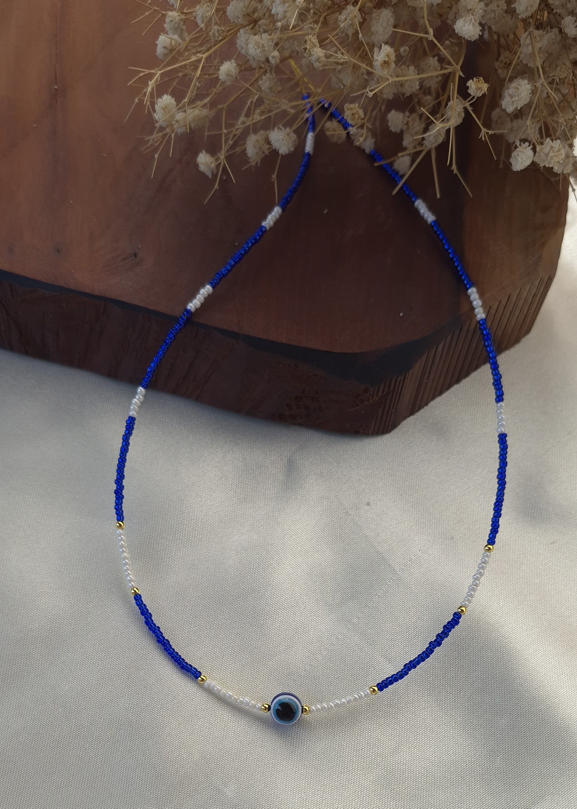 گردنبند زنانه منجوقی رنگ ثابت با ترکیبی از مهره چشمنظر و منجوق های آبی و مرارید ترمه سفید، انتخابی خاص و چشمنواز برای بانوان است.