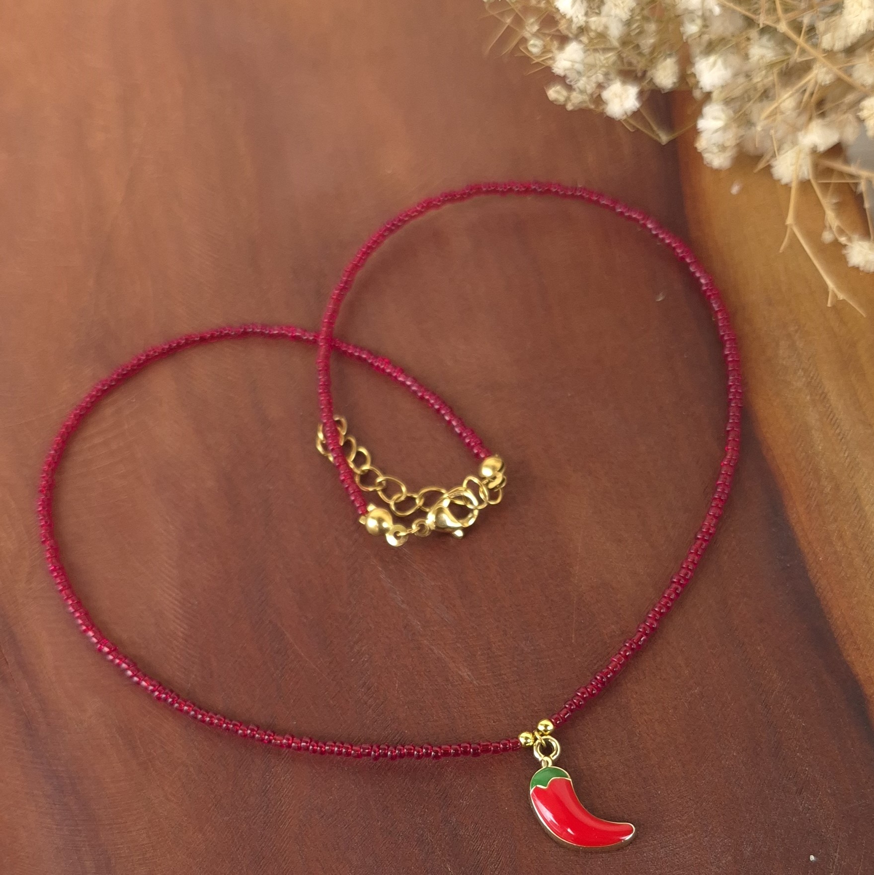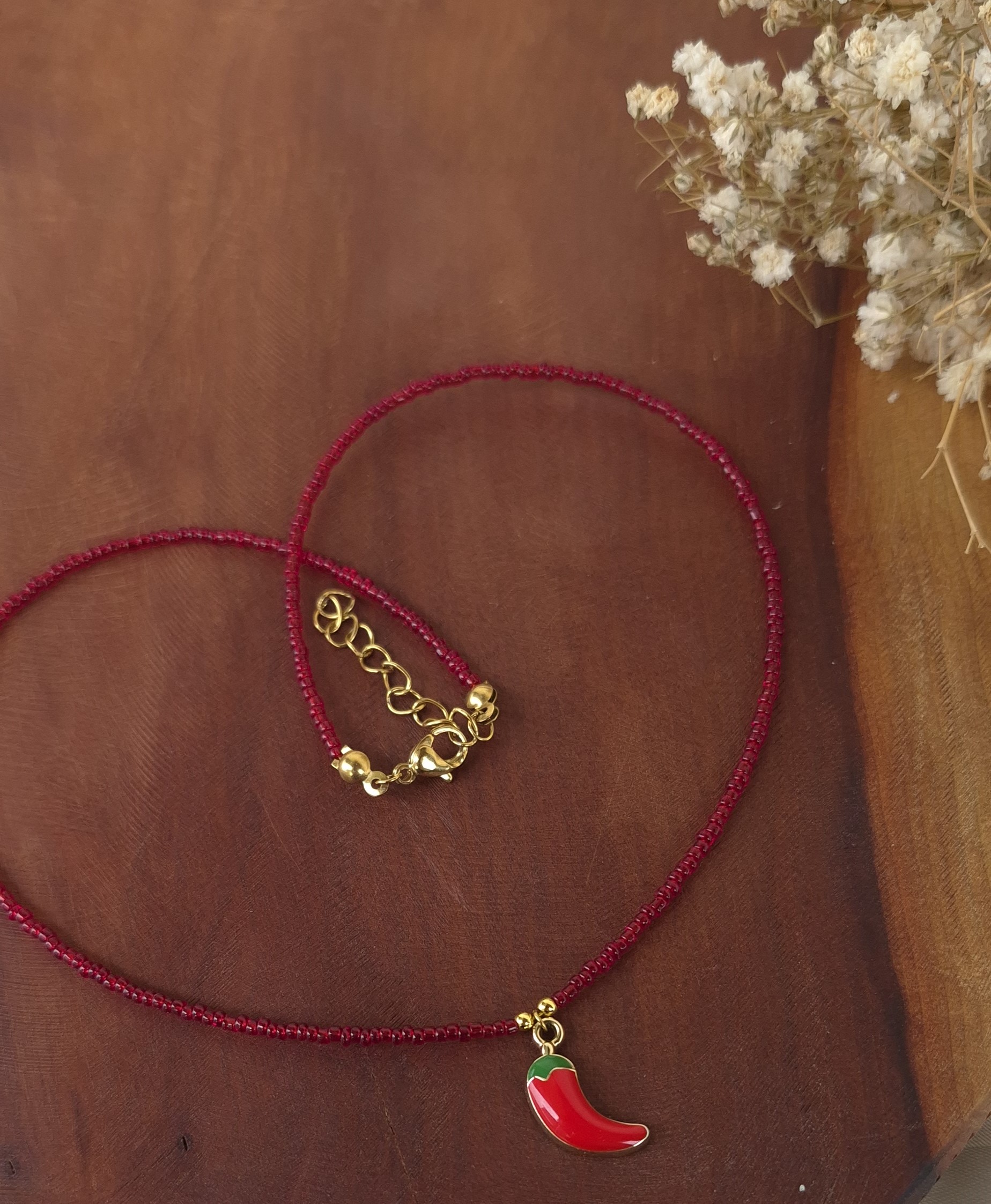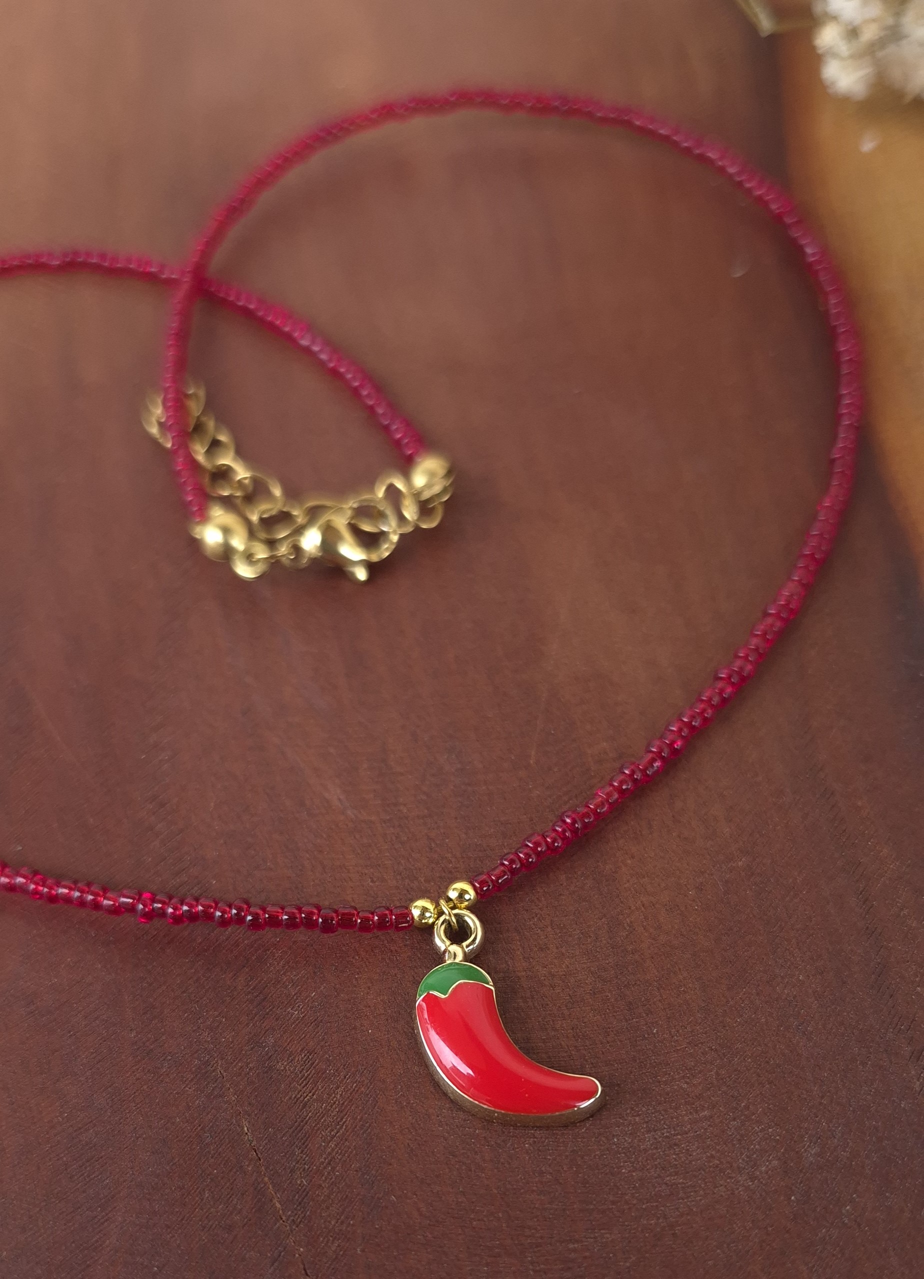💖این گردنبند دخترانه و فانتزی فلفل با مهرههای قرمز و پلاک فلفل قرمز طراحی شده است که یه کار ترند و پر طرفدار در این روزها میباشد.
