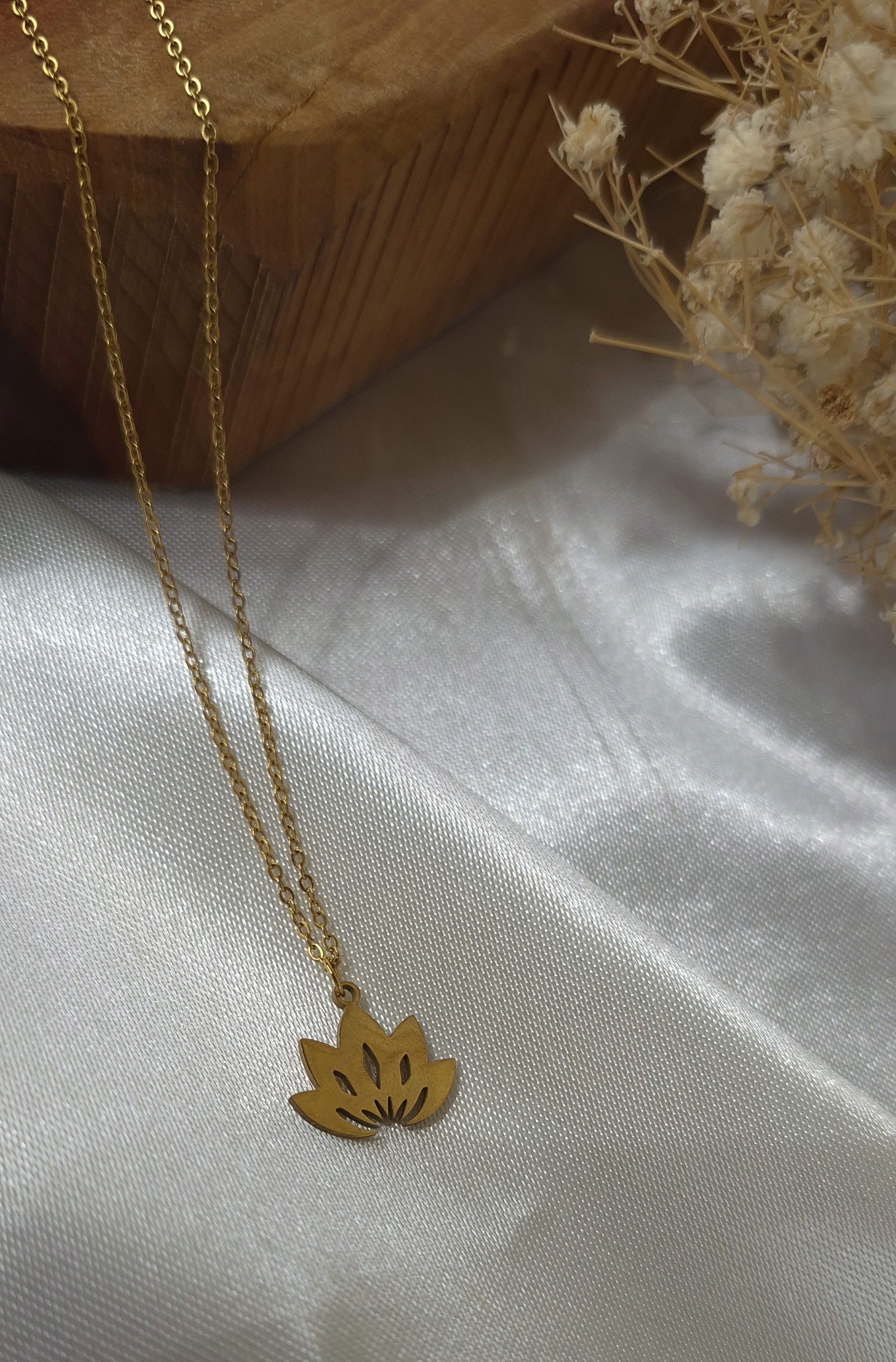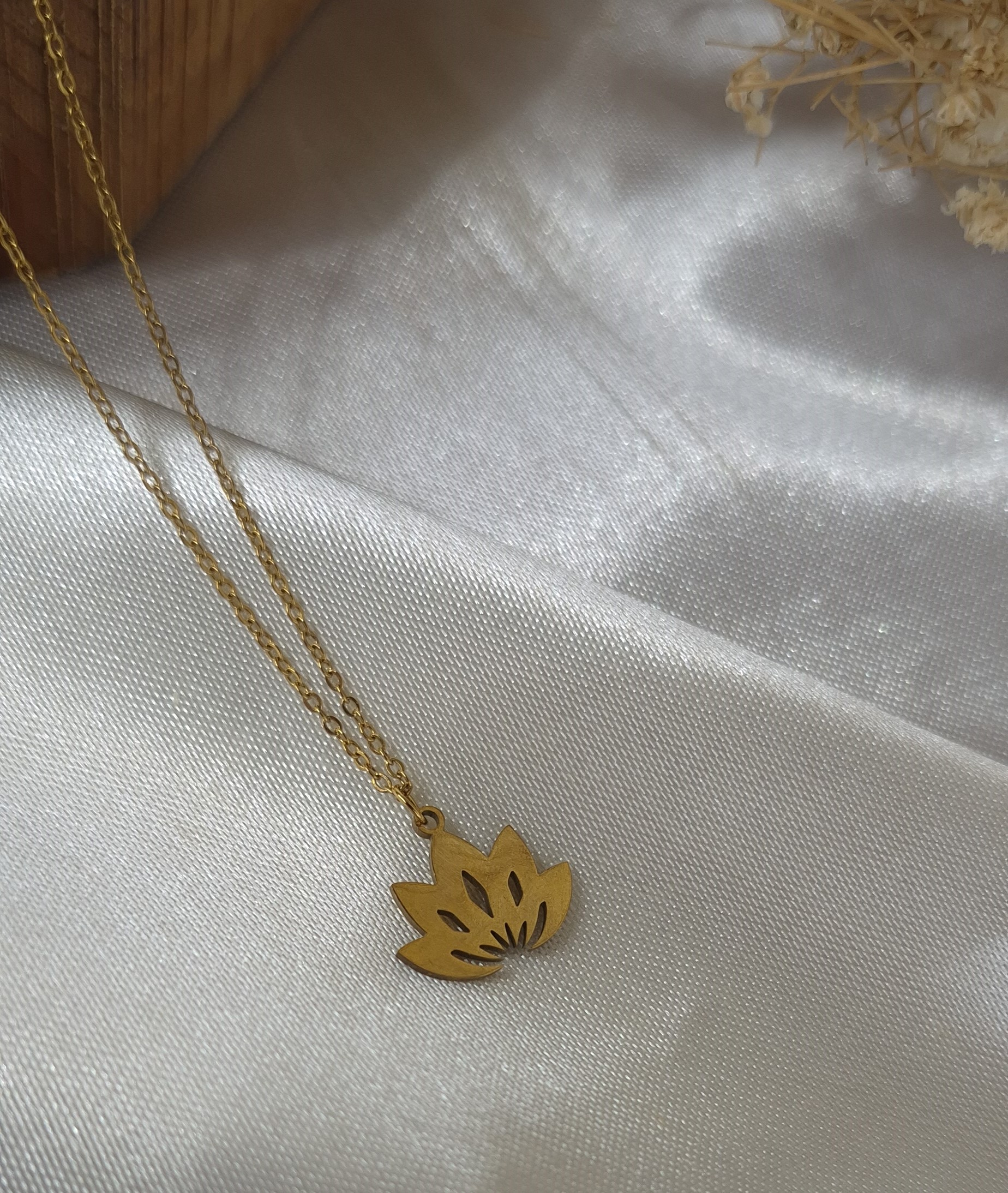 گردنبند استیل طلایی رنگ ثابت مدل گل نیلوفر آبی (لوتوس) مشابه طلا