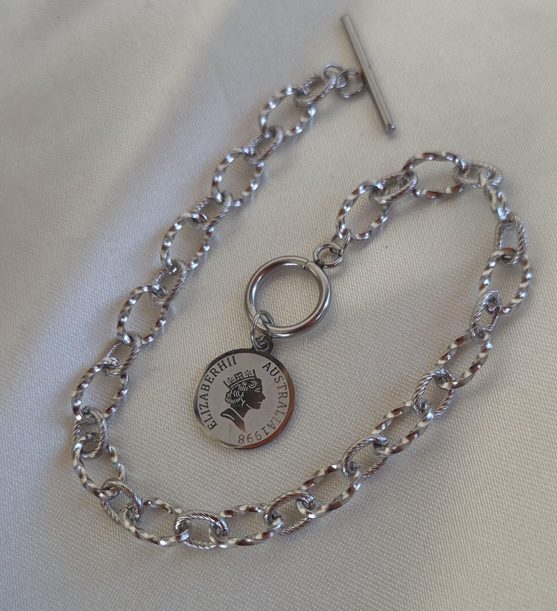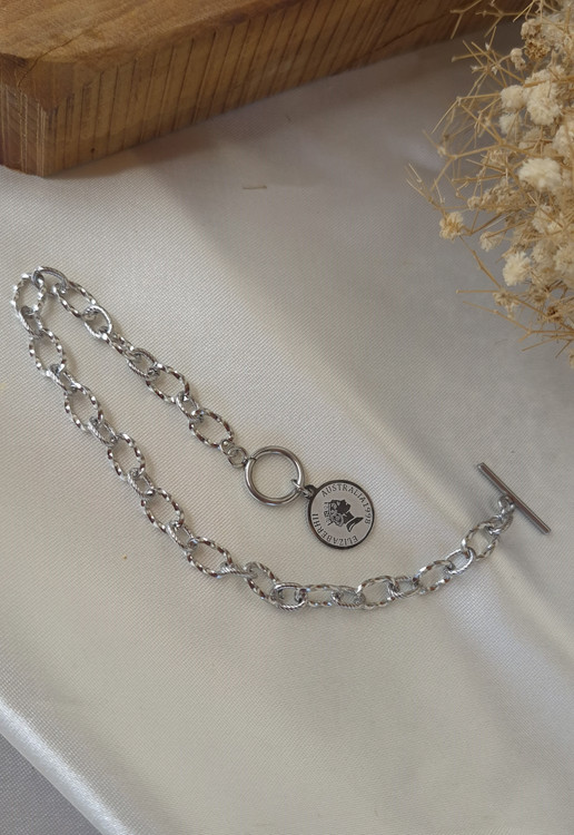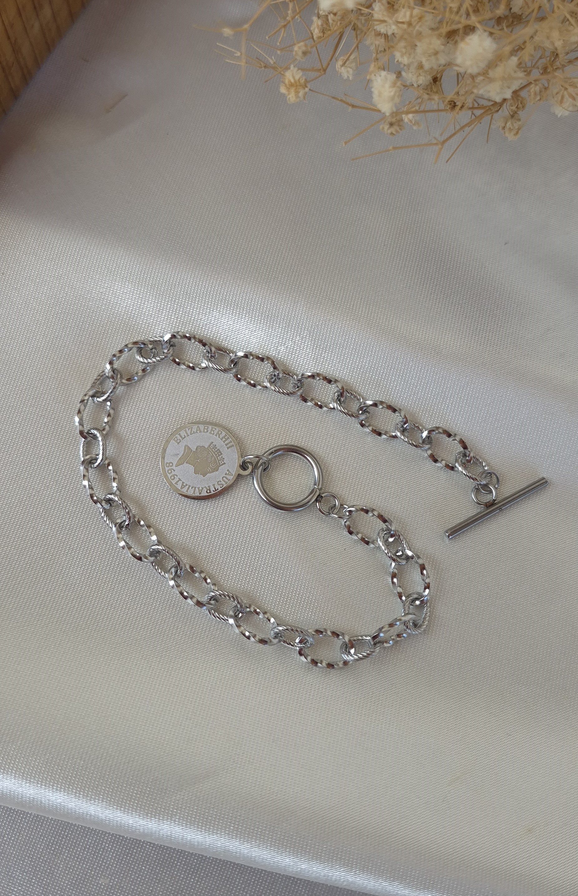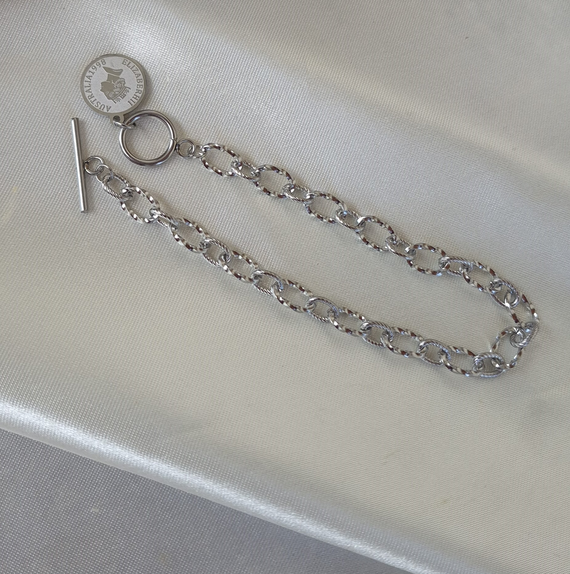 این دستبند زنانه تیفانی تراشدار با طراحی مدرن و شیک، دارای قفل T و آویز الیزابت است که جلوهای خاص و متفاوت به استایل شما میبخشد.