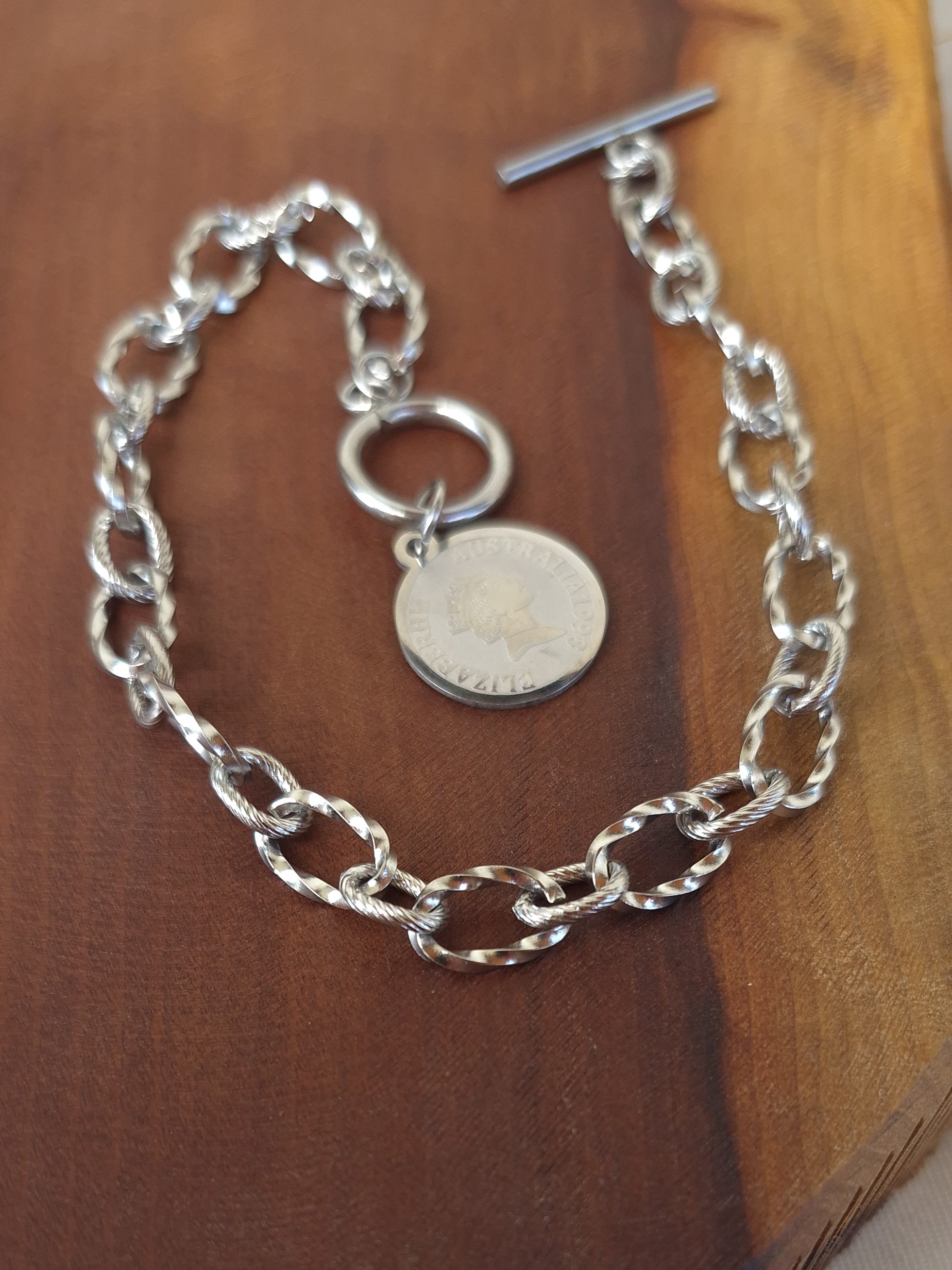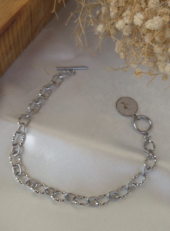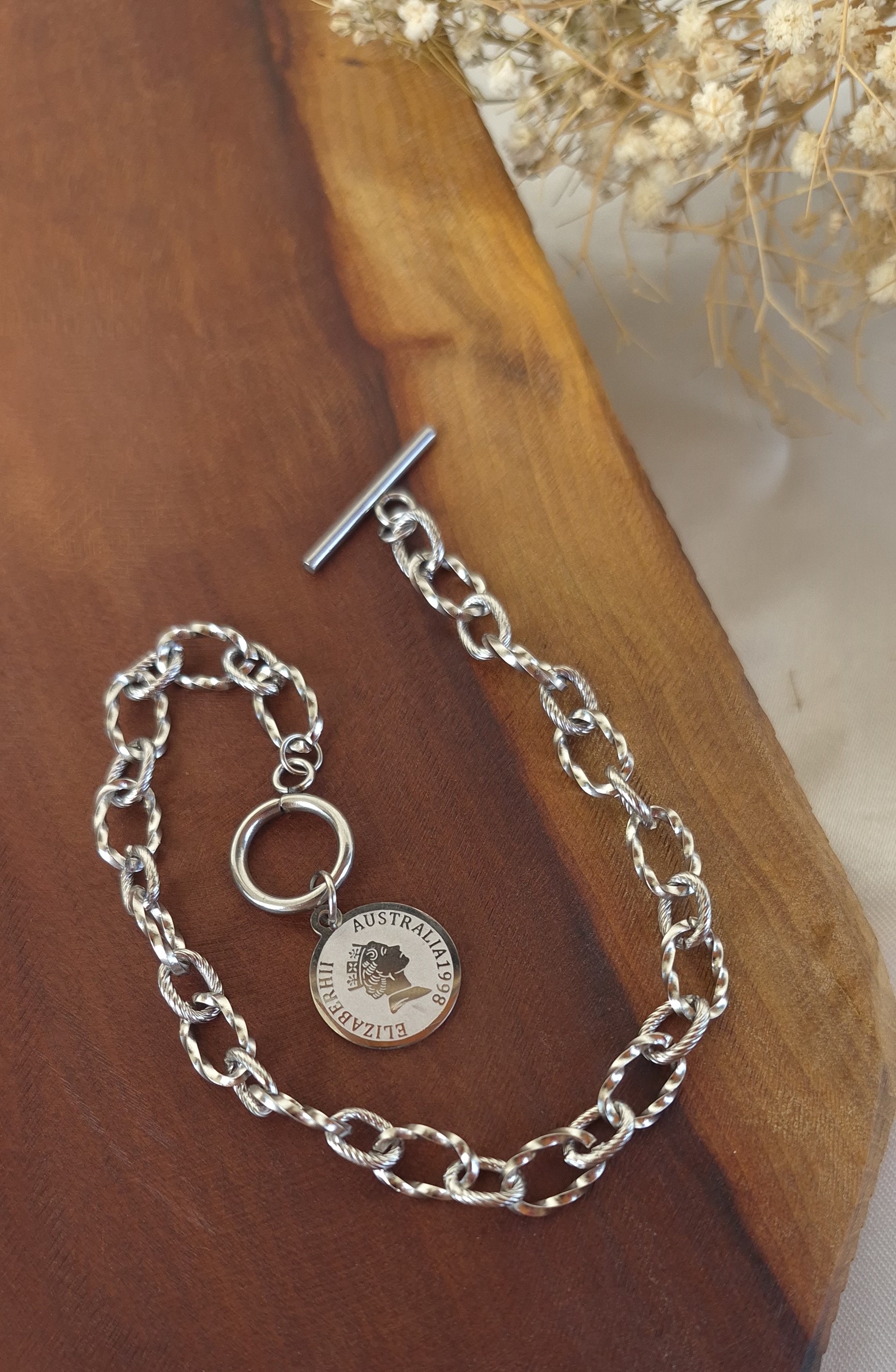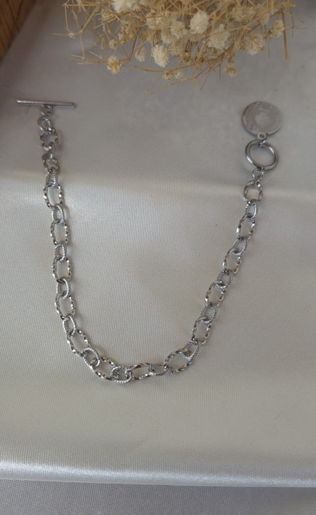 این دستبند زنانه تیفانی تراشدار با طراحی مدرن و شیک، دارای قفل T و آویز الیزابت است که جلوهای خاص و متفاوت به استایل شما میبخشد.