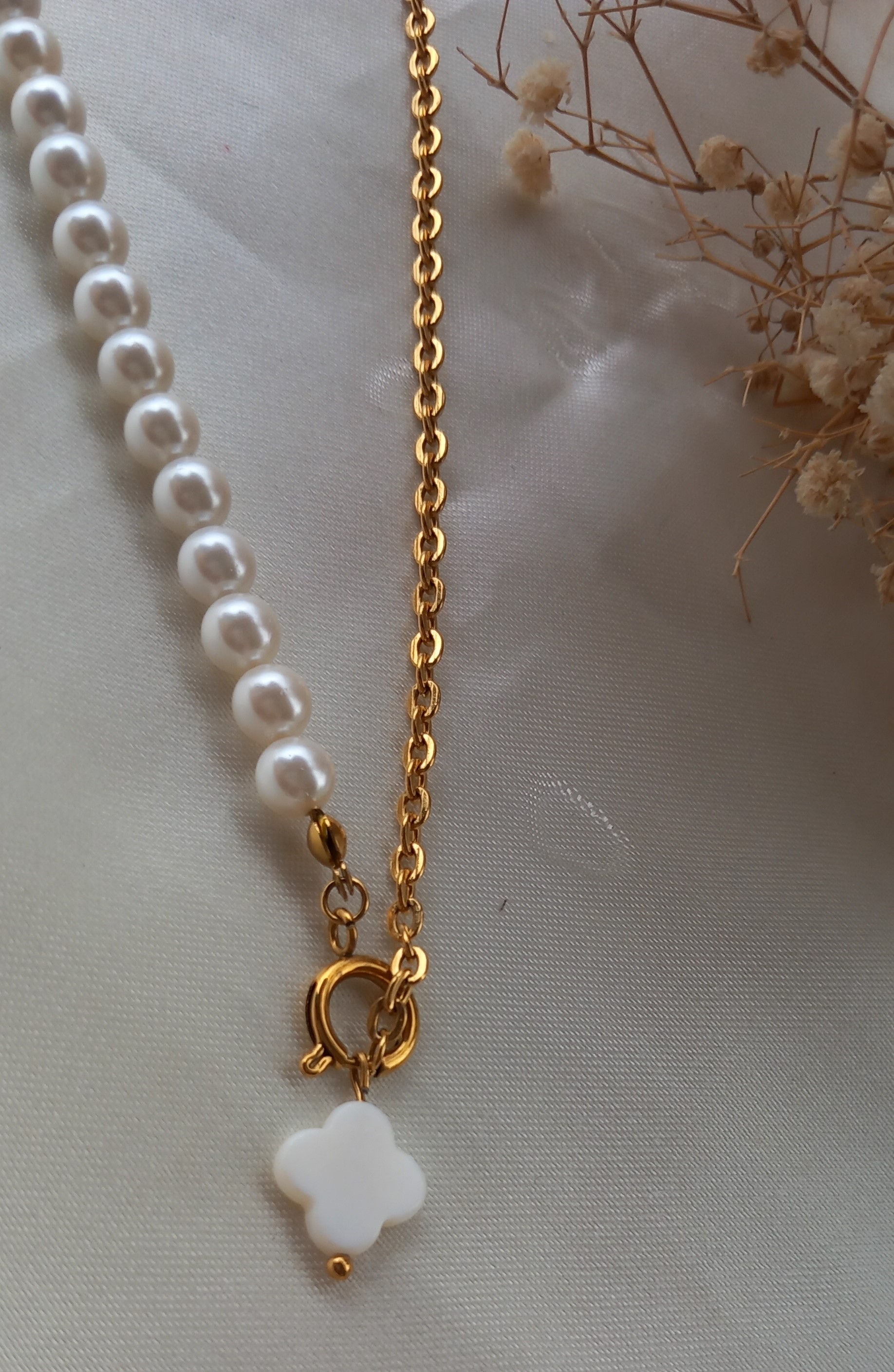 Gold-Tone Stainless Steel Necklace with Natural Shell & Van Cleef Pearl Pendant – Elegant Shell Collection