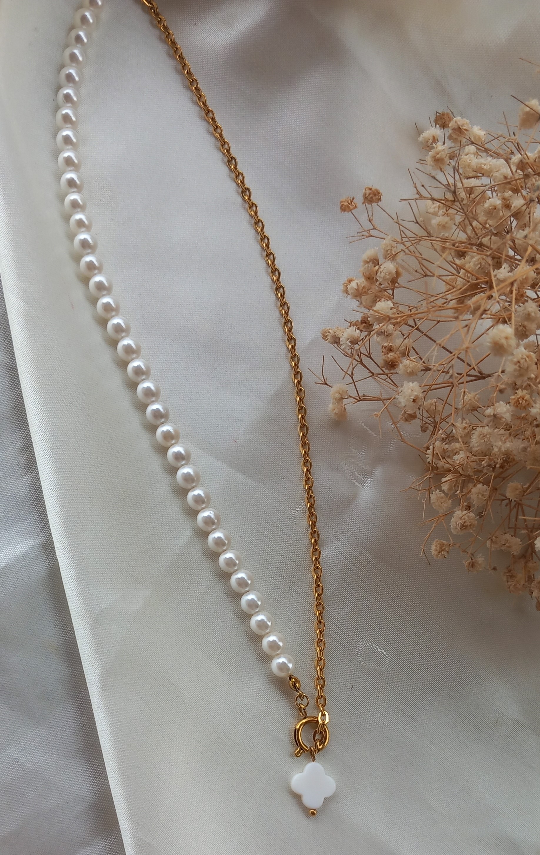 گردنبند زنانه رنگ ثابت مدل مروارید شل و زنجیر استیل با پلاک ونکلیف صدف طبیعی
