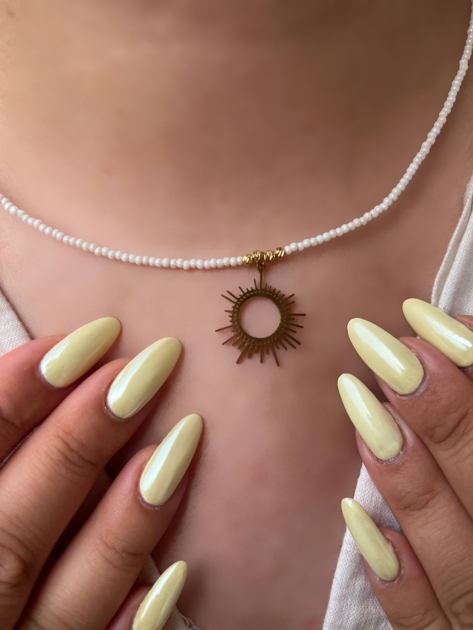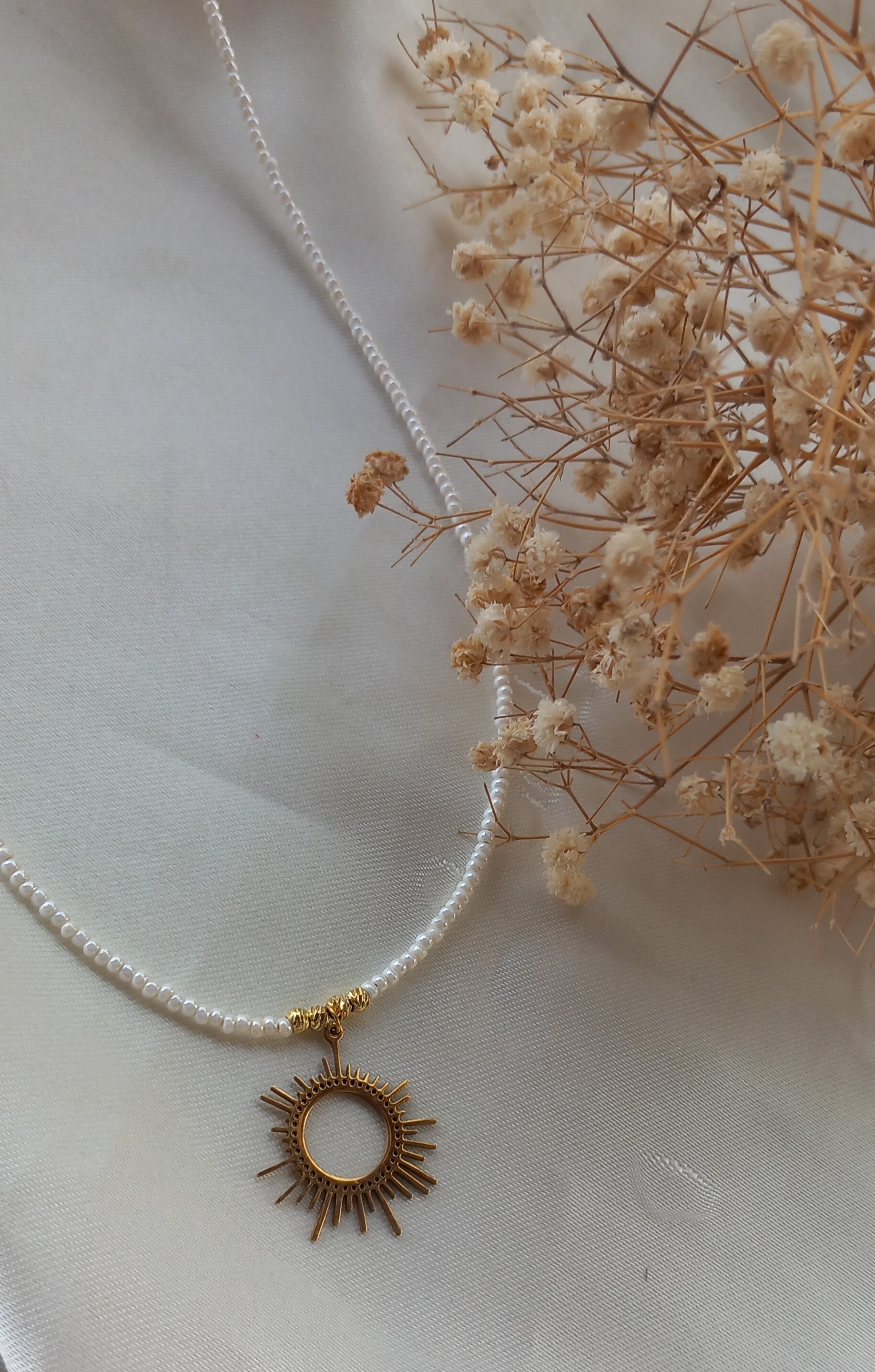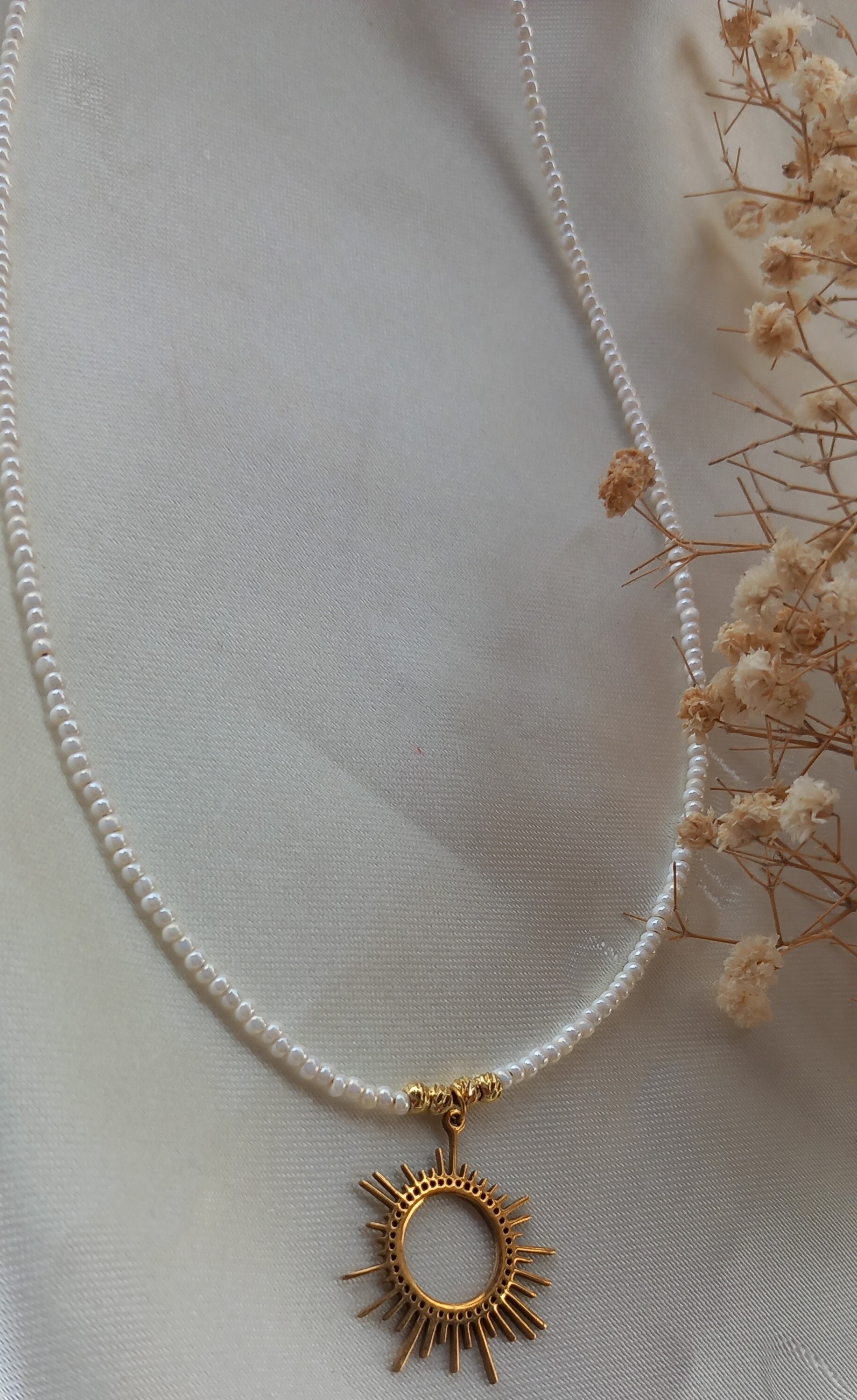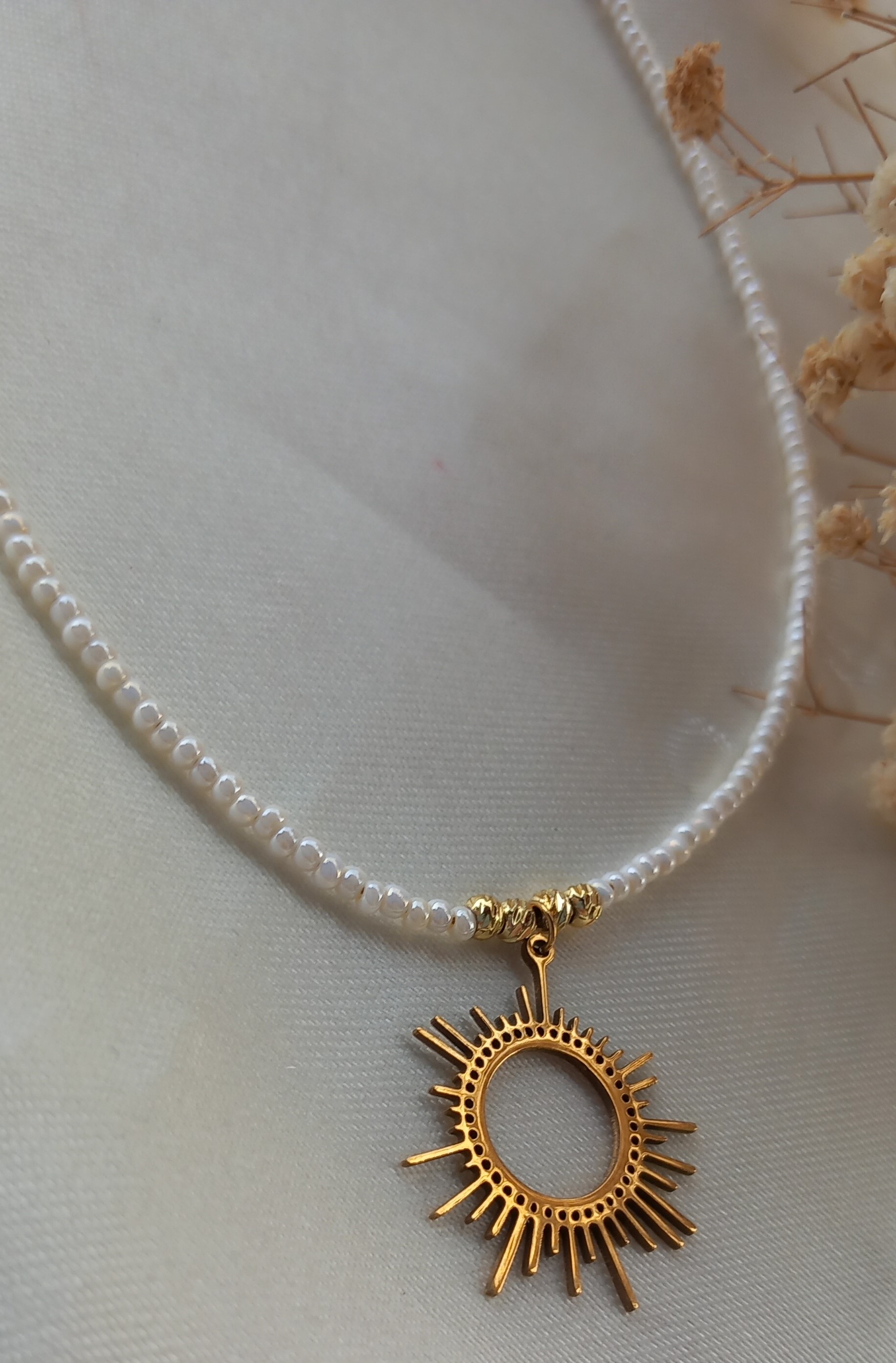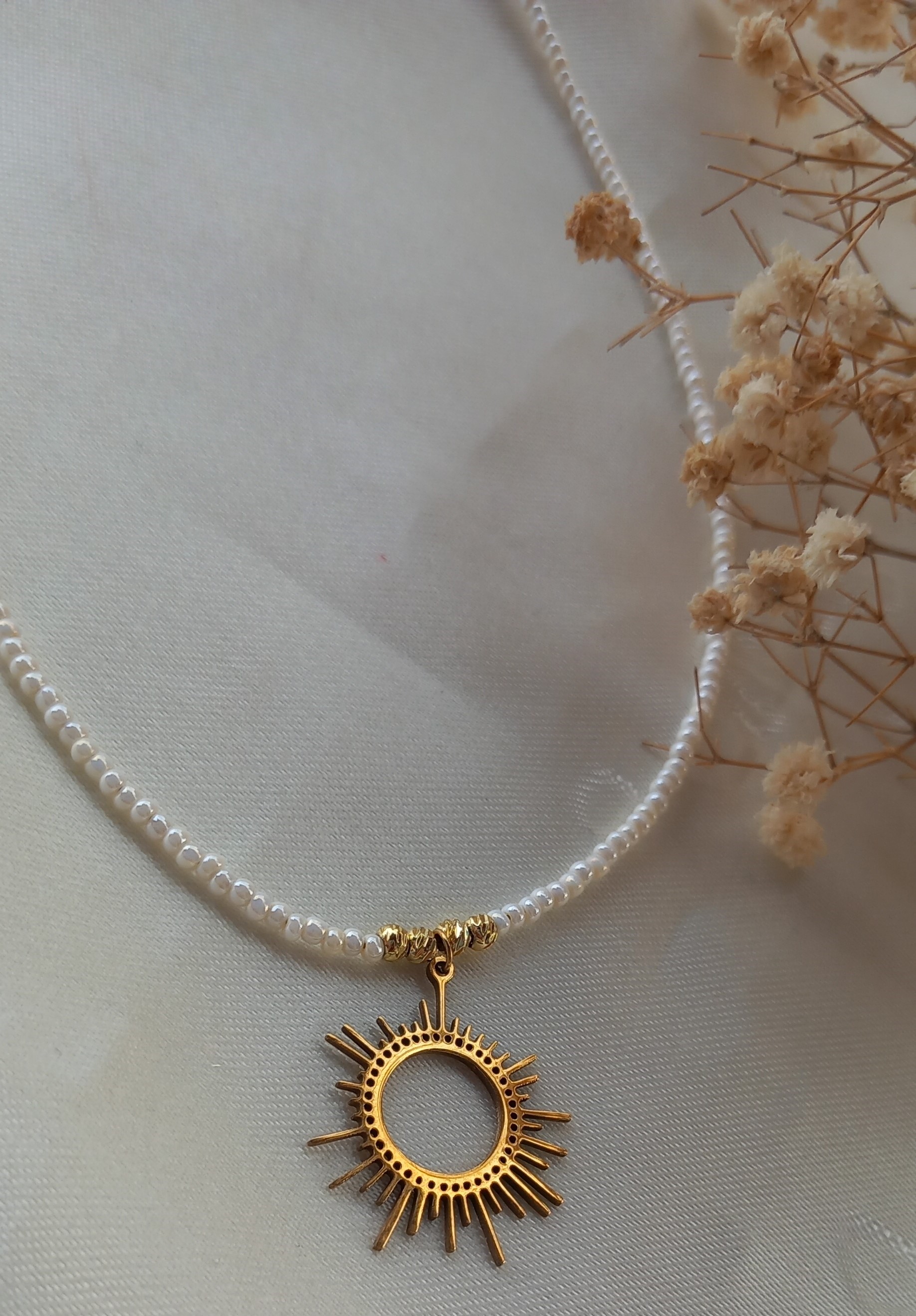 گردنبند زنانه منجوقی سفید (مروارید ترمه) با پلاک استیل طلایی مدل خورشید