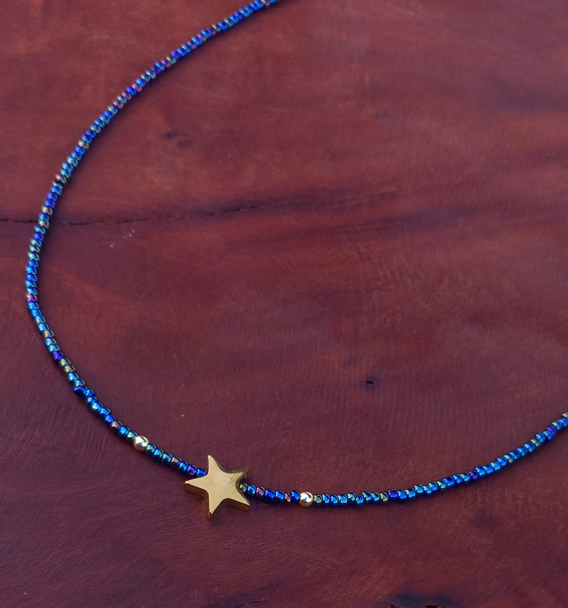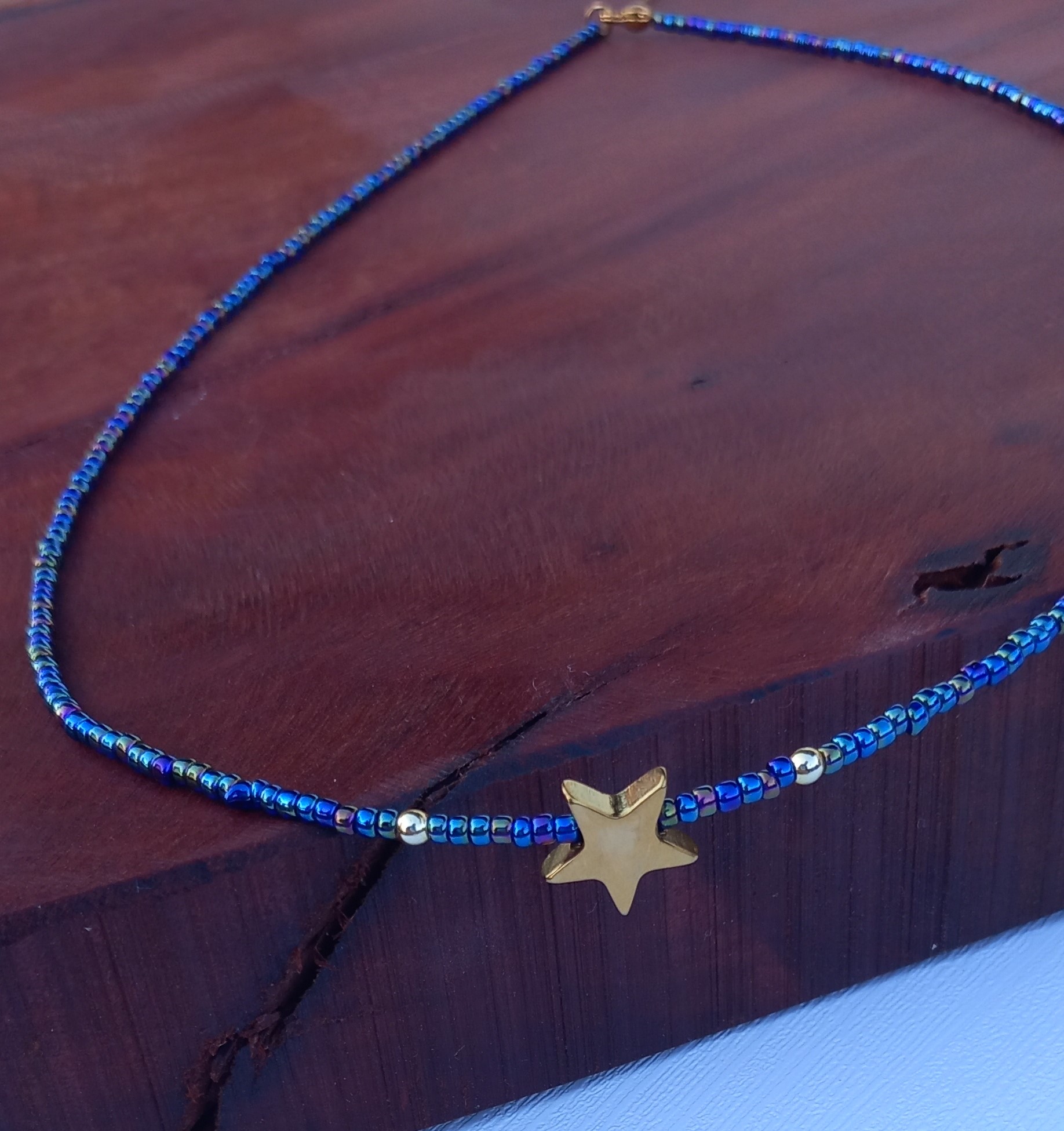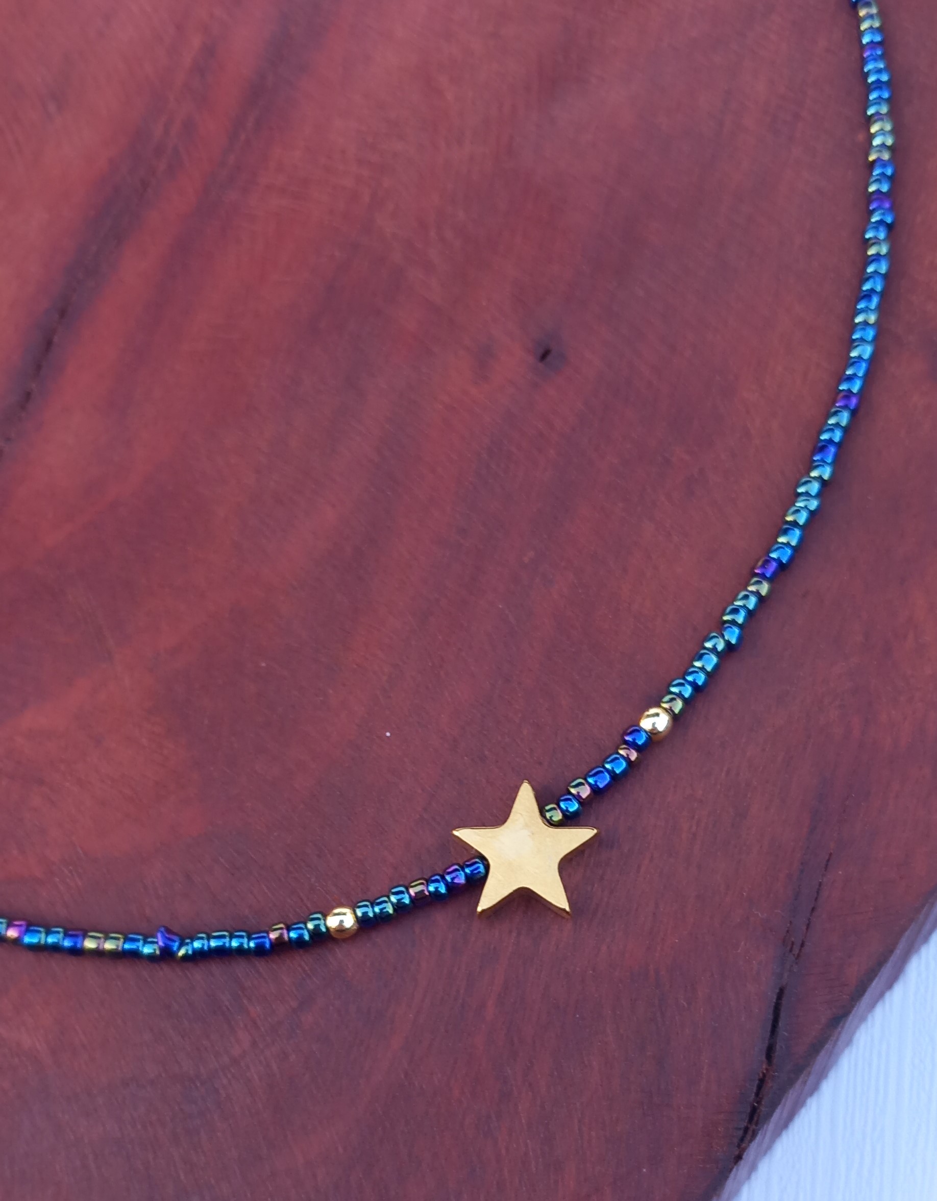 گردنبند زنانه منجوقی سرمهای با پلاک استیل طلایی مدل ستاره، انتخابی شیک و درخشان برای استایلهای مینیمال و خاص است.