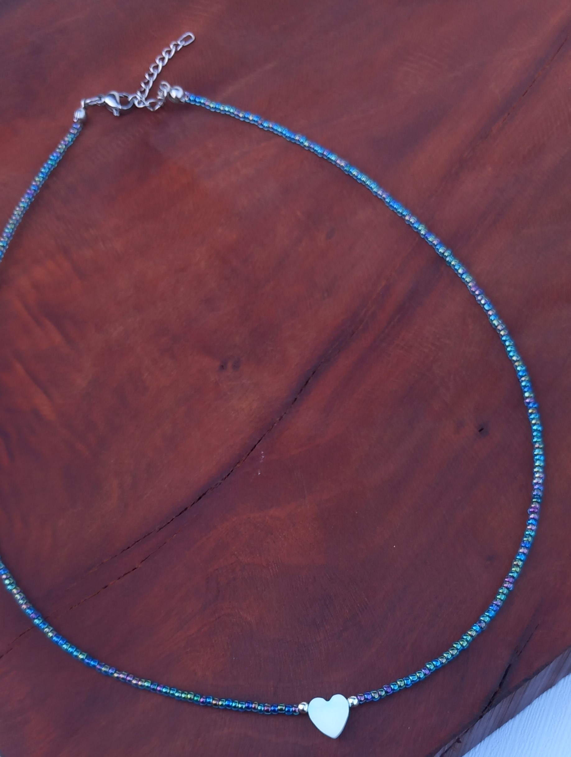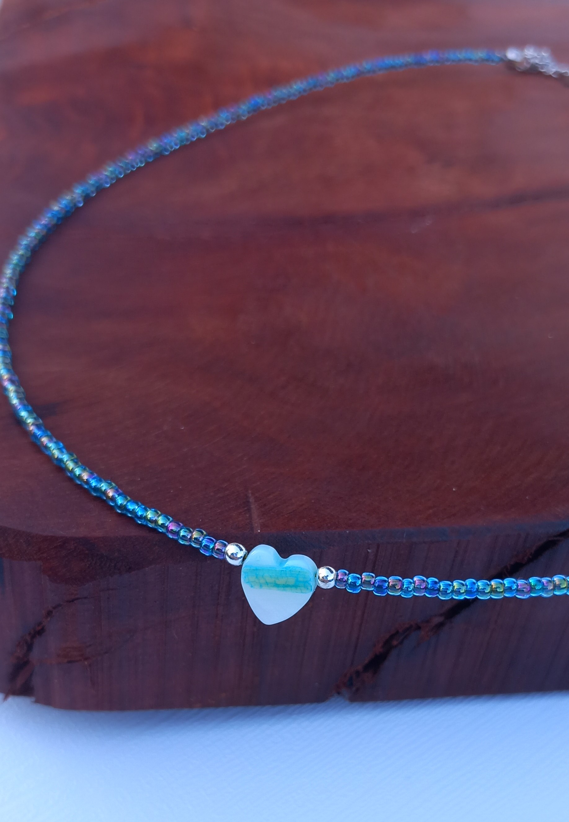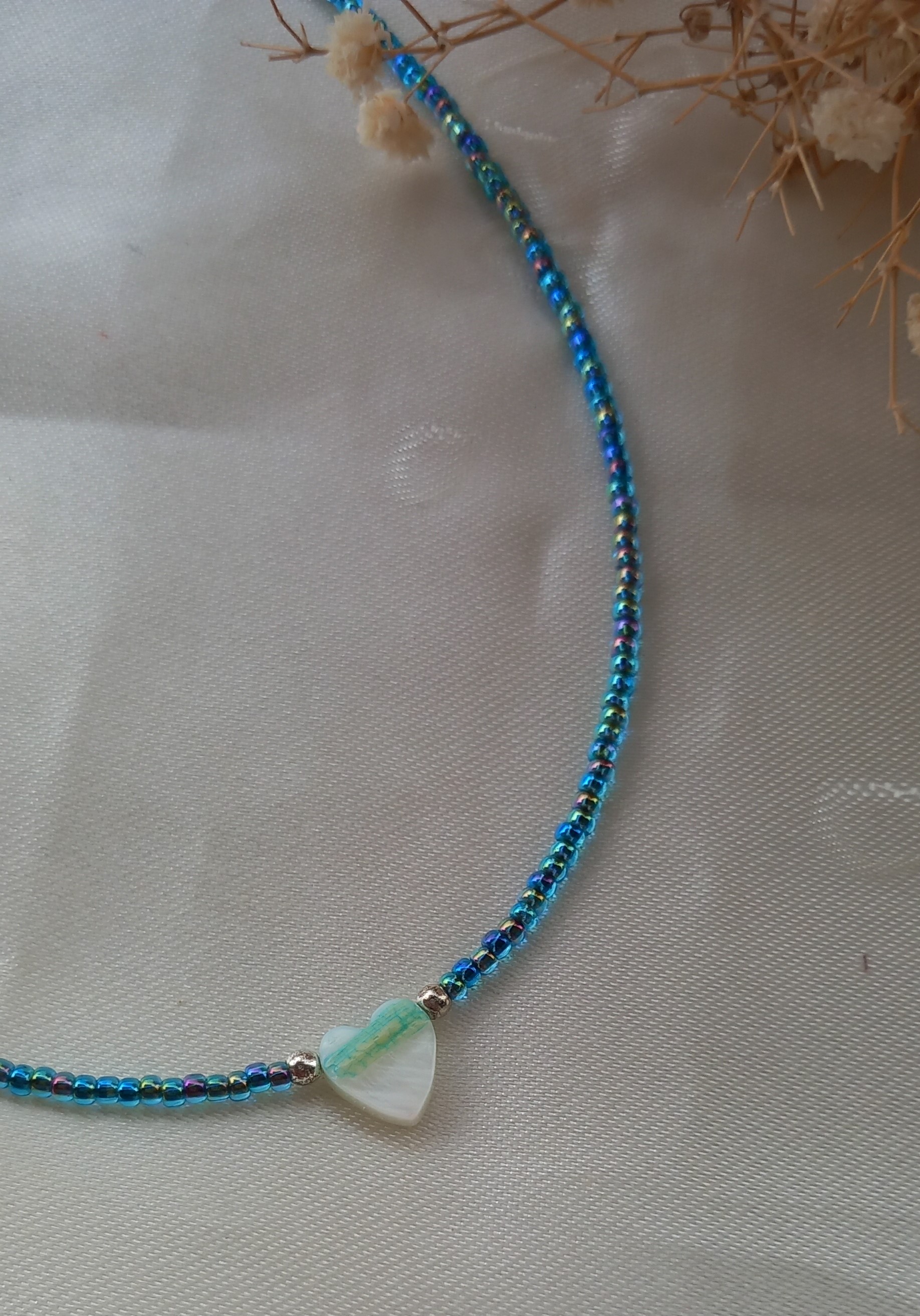 گردنبند زنانه منجوقی آبی رنگ ثابت با صدف طبیعی طرح قلبی، تلفیقی از انرژی دریا و لطافت عشق است.