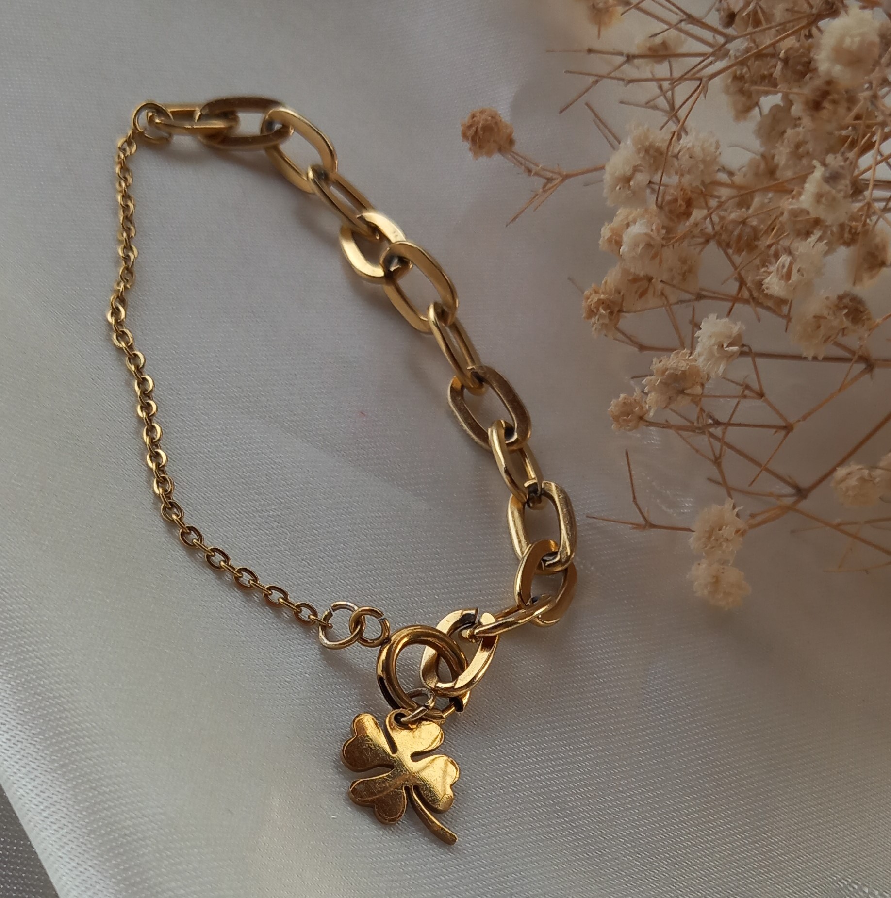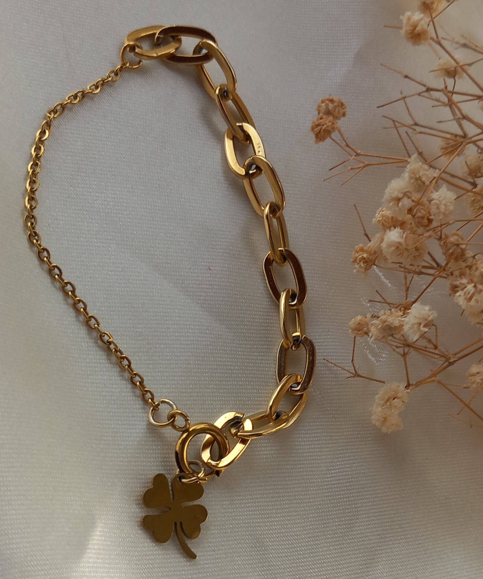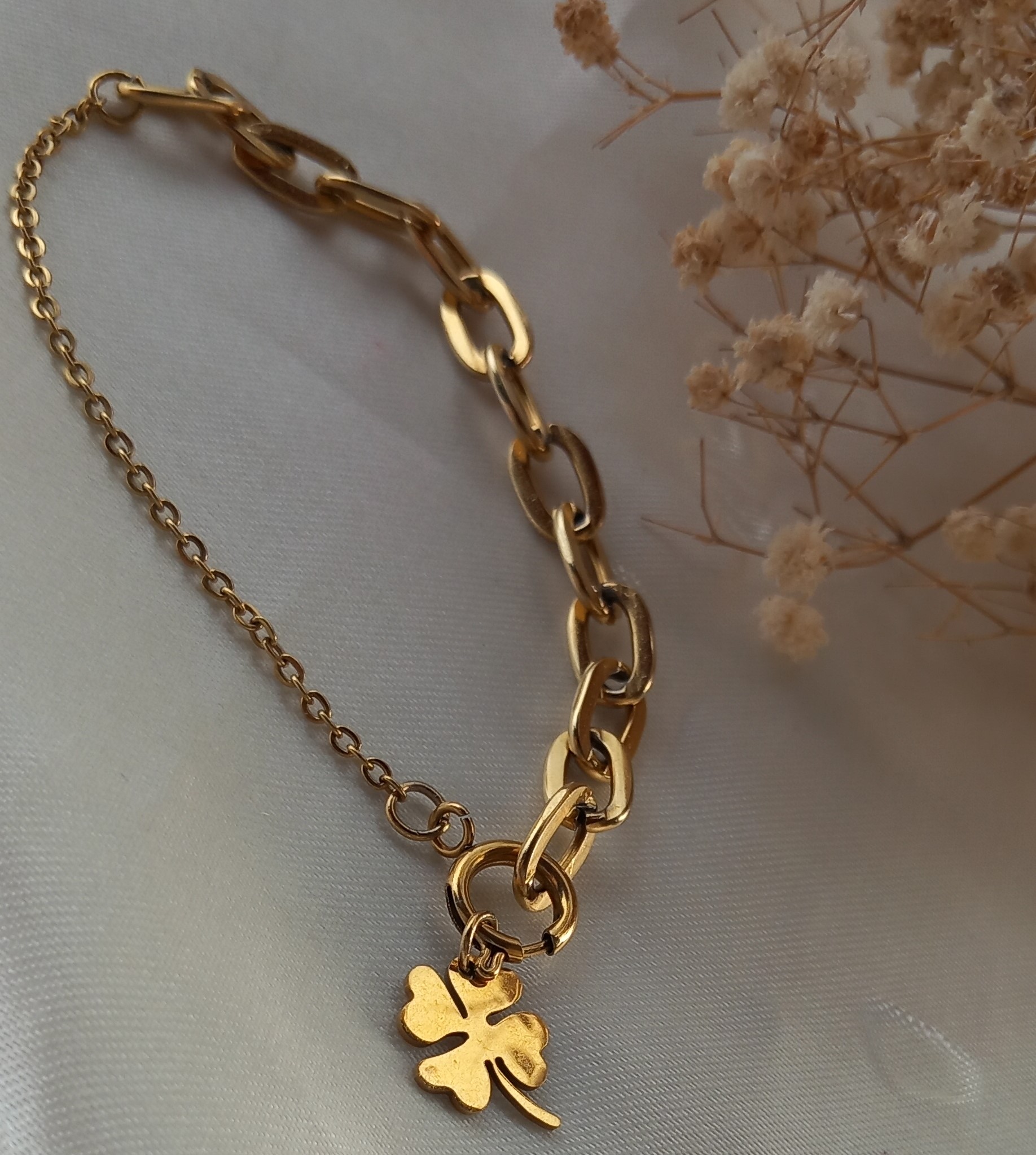 دستبند استیل زنانه با قفل ملوانی و پلاک شبدر مدل فلامینگو طلایی