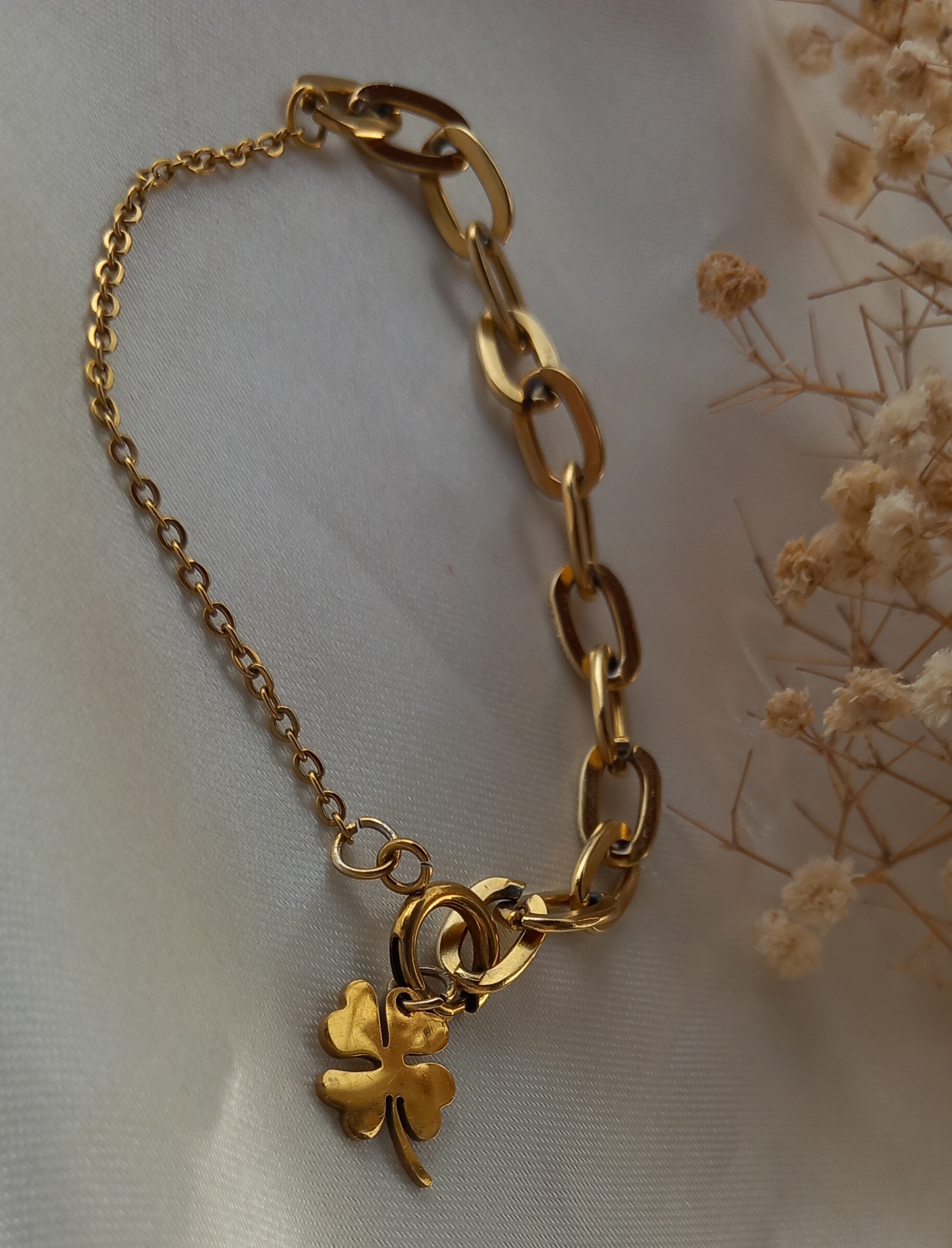 دستبند زنانه استیل طلایی رنگ ثابت با قفل ملوانی و پلاک شبدر مدل فلامینگو، ترکیبی از شیک بودن و انرژی مثبت است.