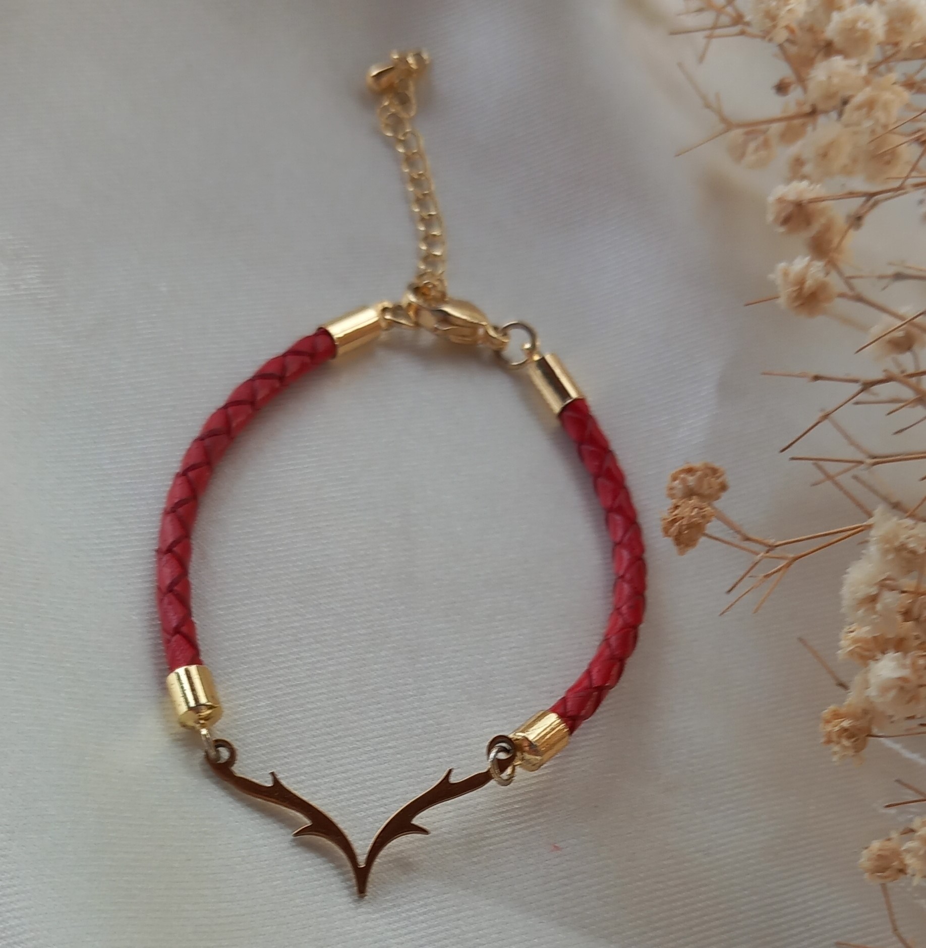 دستبند زنانه چرم طبیعی قرمز با پلاک استیل طلایی مدل شاخ گوزن، انتخابی خاص برای بانوانی است که به استایل جسورانه و درعینحال شیک علاقه دارند.