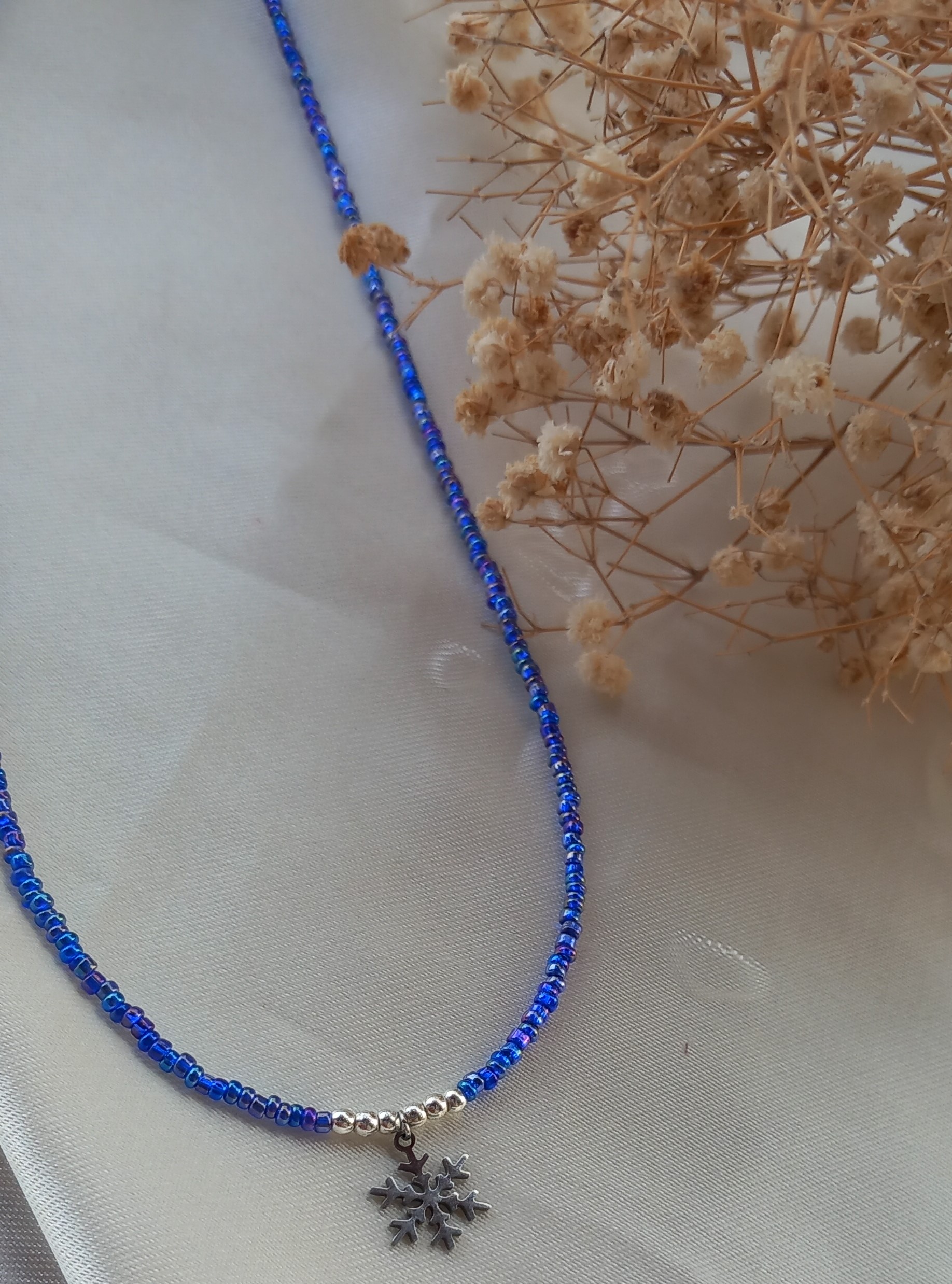 گردنبند زنانه منجوقی آبی رنگ ثابت با پلاک استیل نقرهای مدل گلوله برف، انتخابی خاص برای بانوانی است که عاشق استایلهای زمستانی و مینیمال هستند.