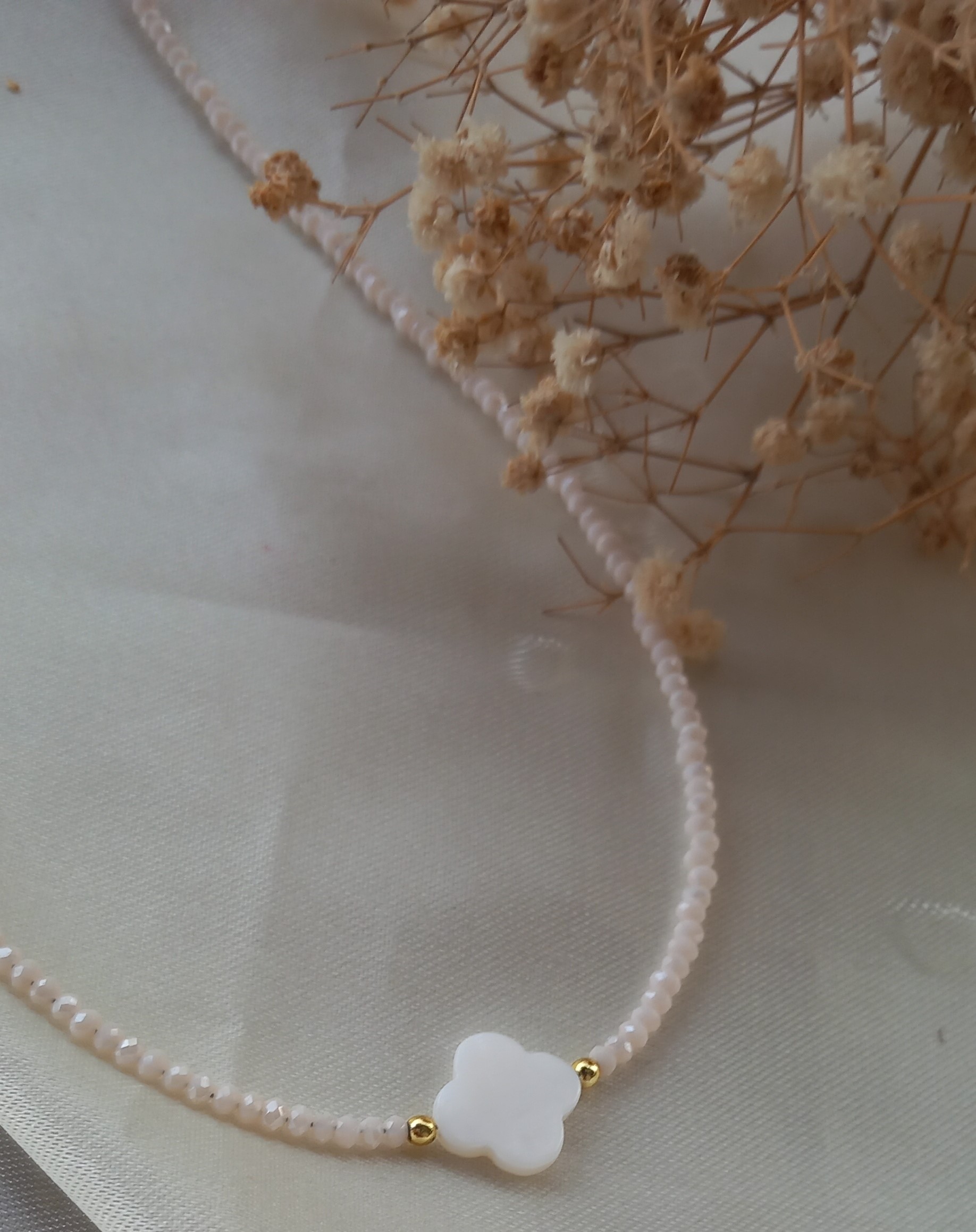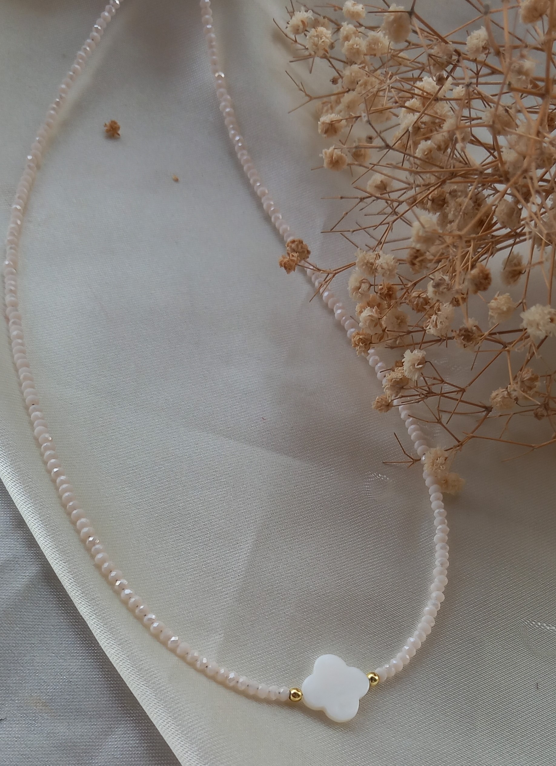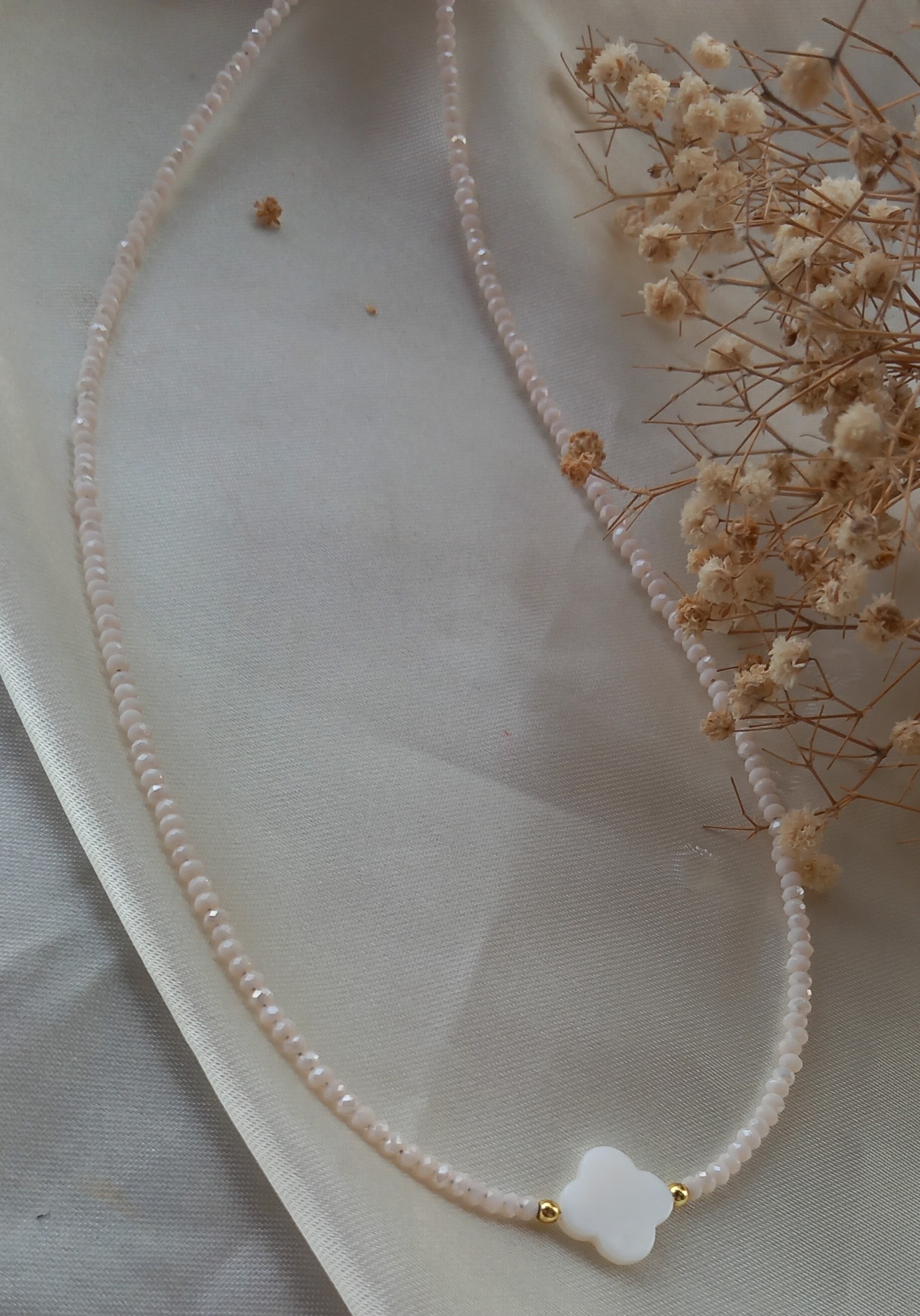 گردنبند زنانه کریستالی نباتی رنگ ثابت با صدف طبیعی طرح ونکلیف، ترکیبی از ظرافت و زیبایی طبیعی است.