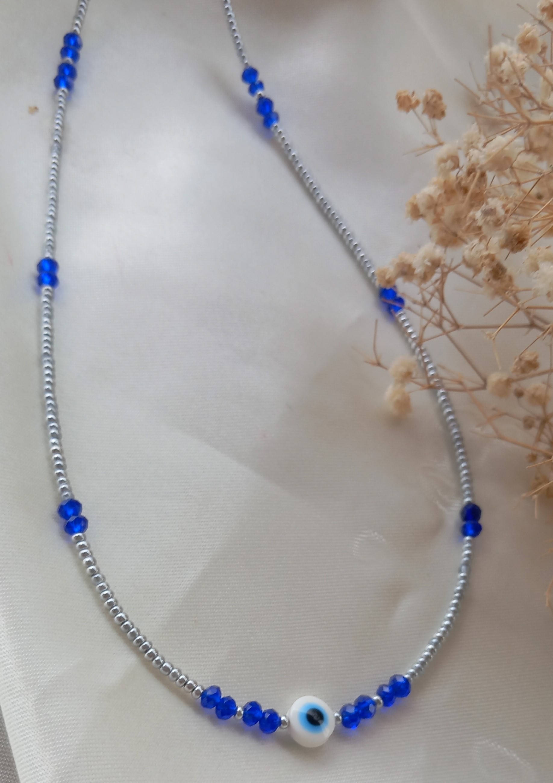 گردنبند زنانه منجوقی نقرهای رنگ ثابت با ترکیبی از مهره چشمنظر و کریستالهای آبی، انتخابی خاص و چشمنواز برای بانوان است.