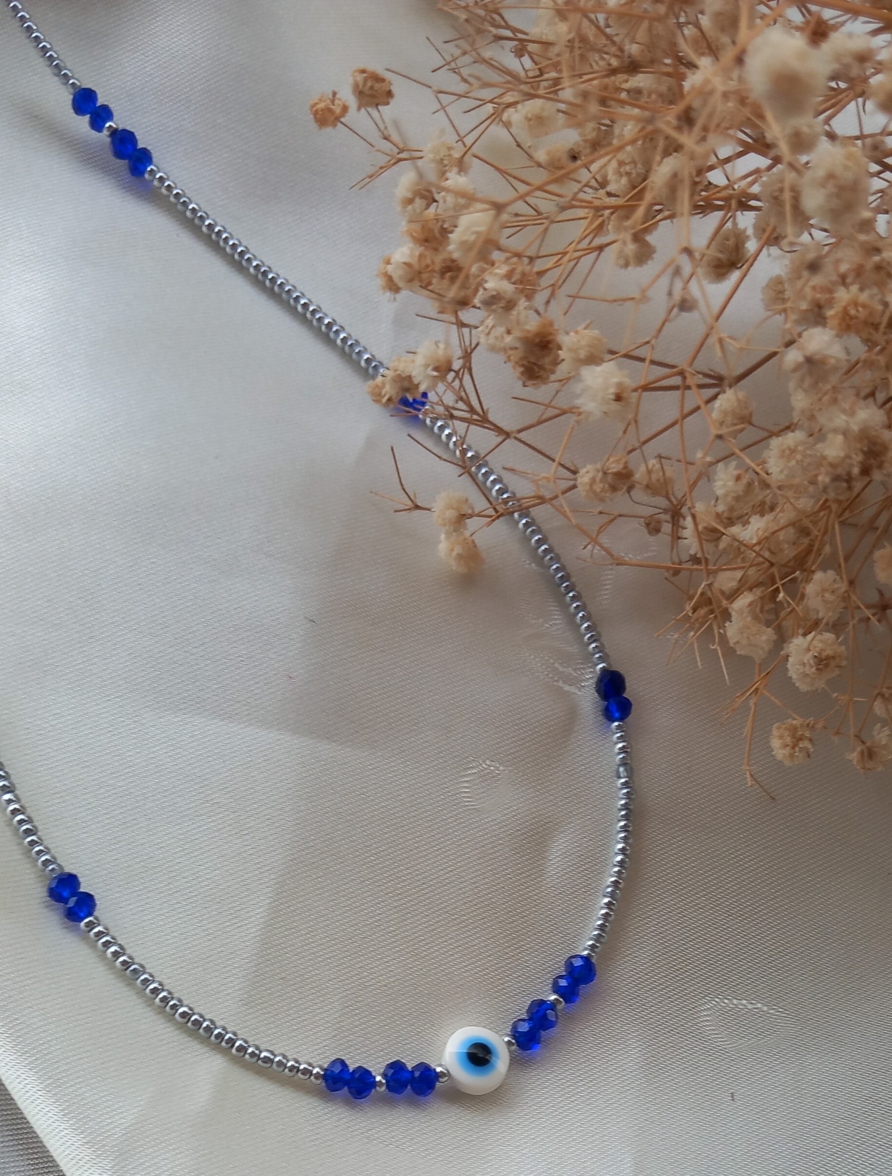 مهره چشمنظر نماد محافظت، خوششانسی و انرژی مثبت است و کریستالهای آبی جلوهای درخشان و آرامشبخش به گردنبند میبخشند.