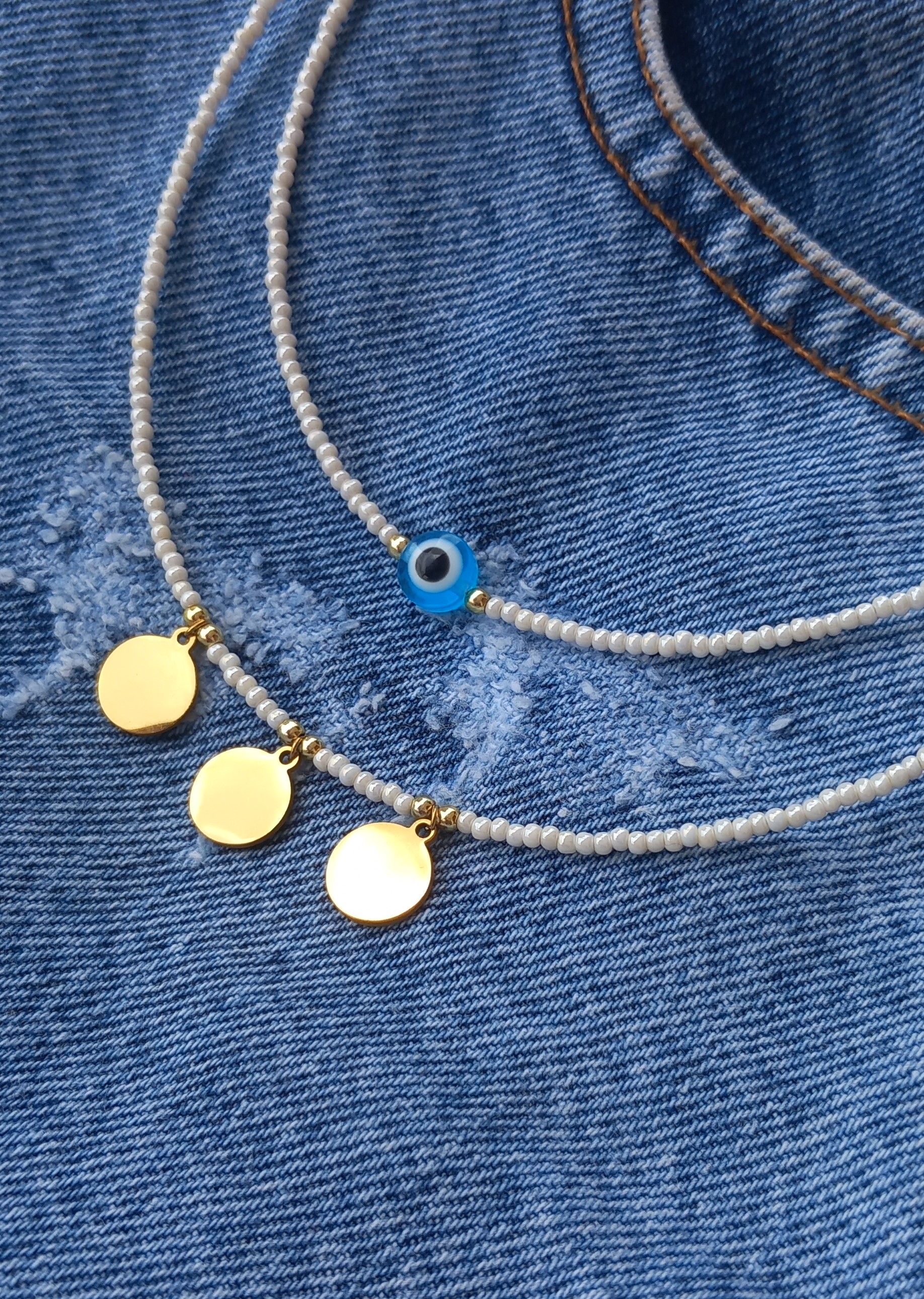 گردنبند زنانه منجوقی سفید (مروارید ترمه) با پلاک استیل مدل سکه‌ای روکو و چشم نظر