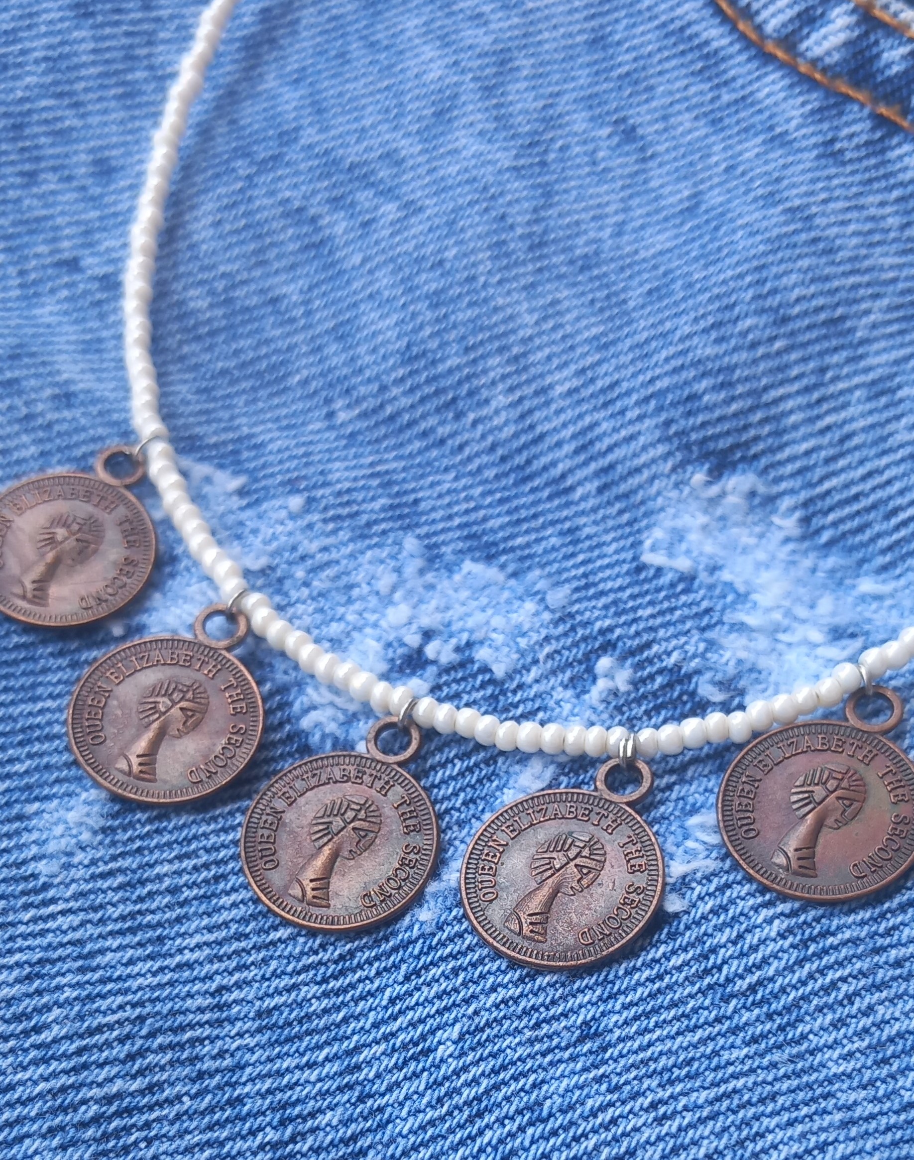 گردنبند زنانه منجوقی سفید (مروارید ترمه) با سکه‌های برنجی مدل بوهو
