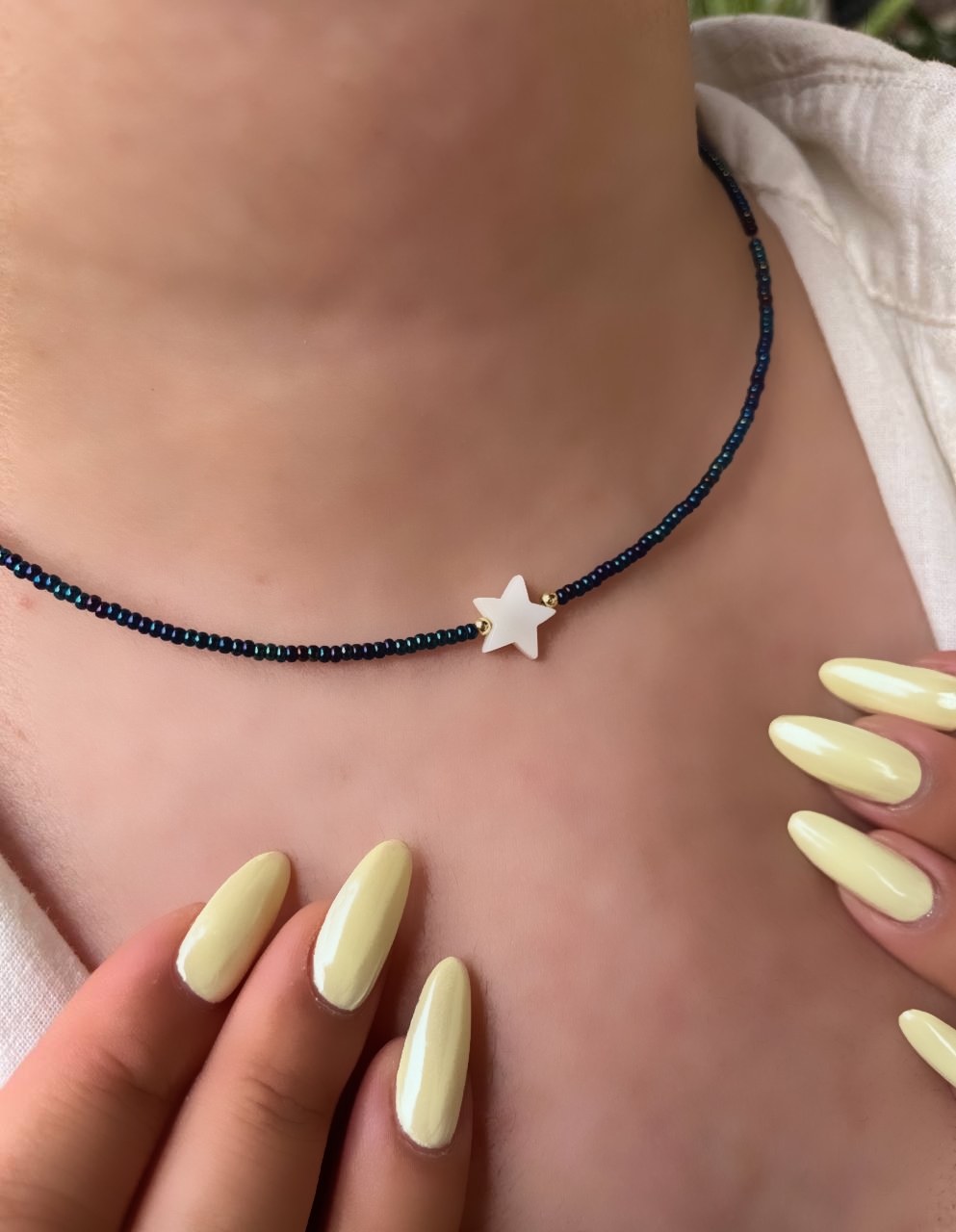 گردنبند زنانه منجوقی سرمه‌ای رنگ ثابت مدل ستاره صدفی طبیعی