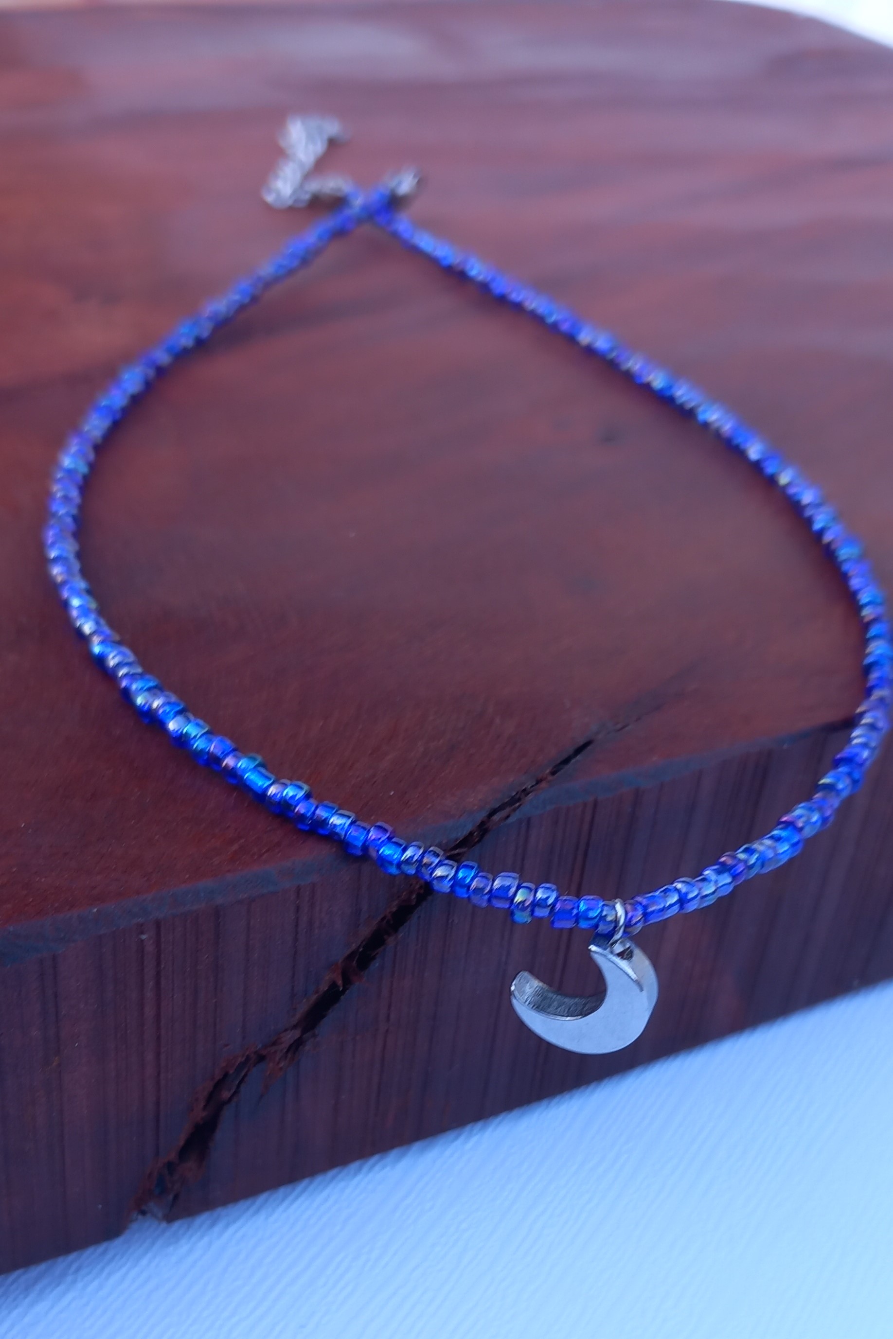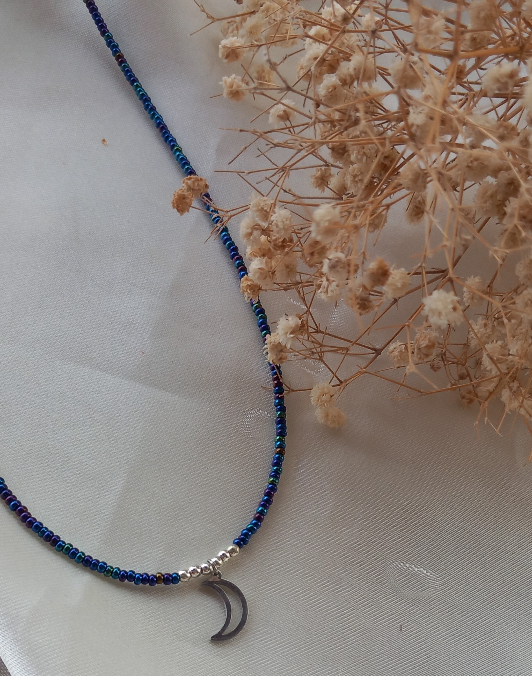 گردنبند زنانه منجوقی آبی با پلاک استیل نقره‌ای مدل ماه