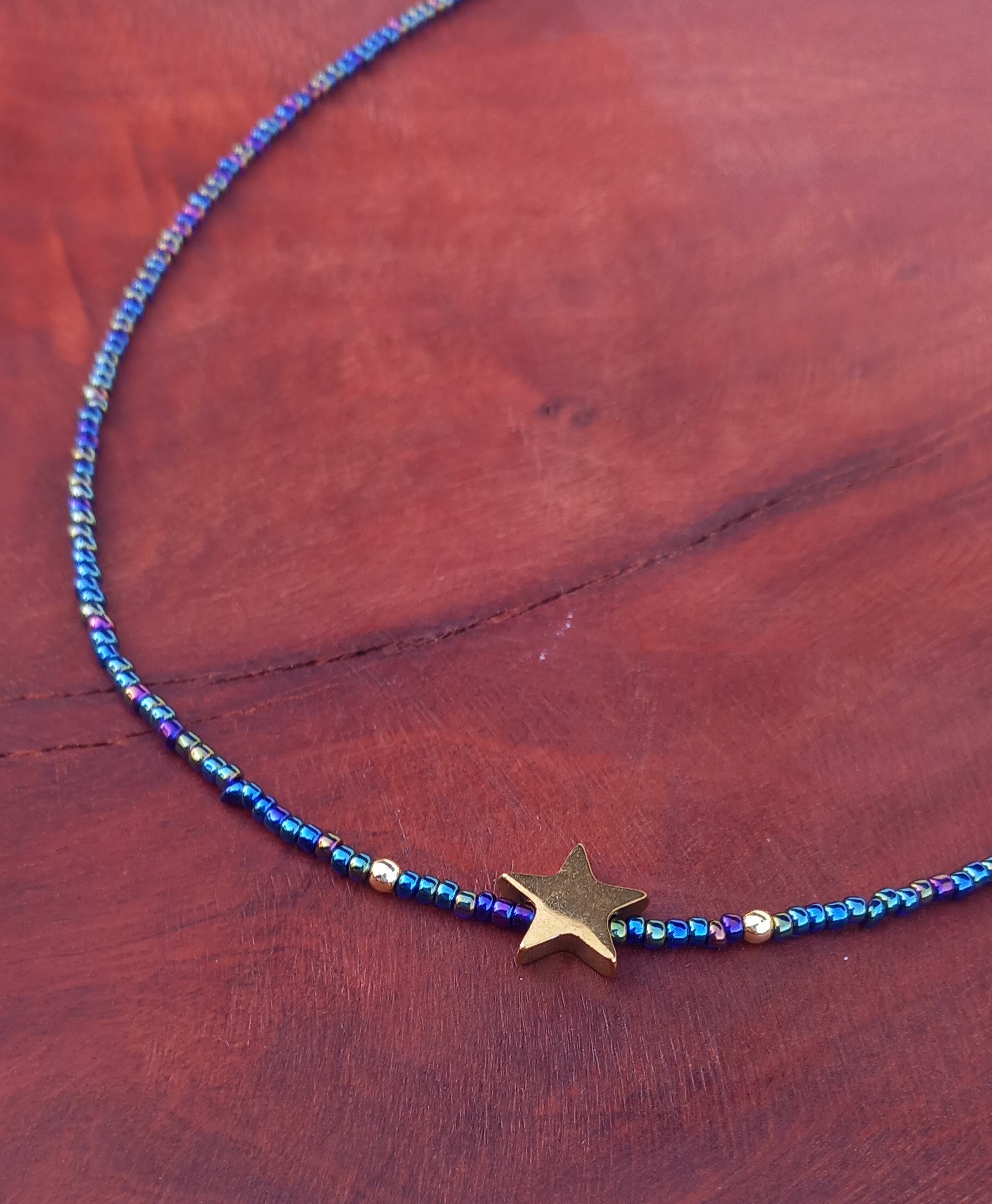 گردنبند زنانه منجوقی سرمه‌ای با پلاک استیل طلایی مدل ستاره