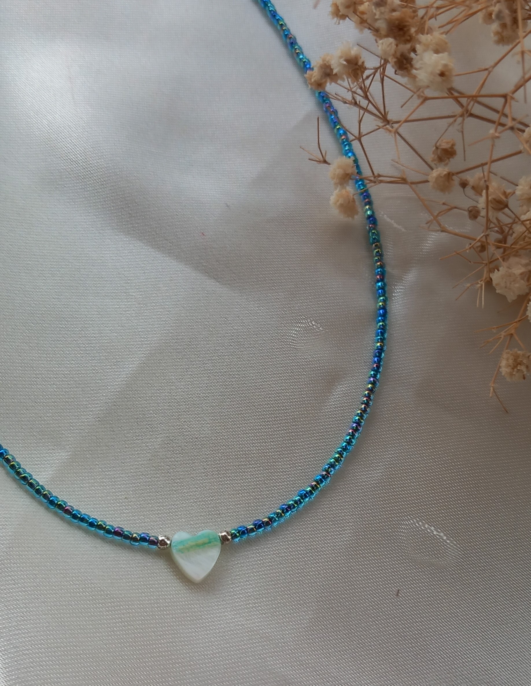 گردنبد زنانه منجوقی آبی رنگ ثابت با صدف طبیعی قلبی