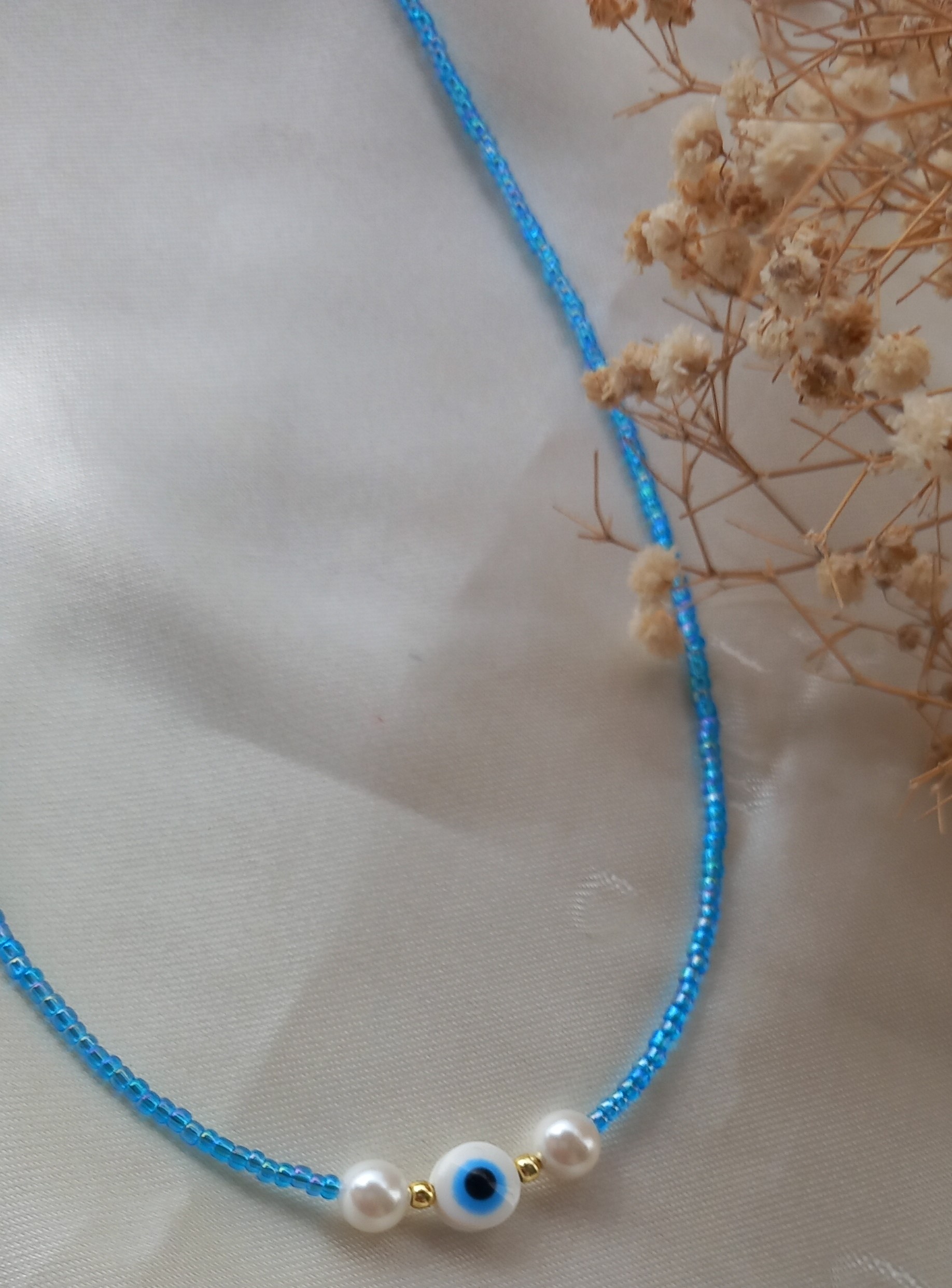 گردنبند زنانه منجوقی آبی رنگ ثابت ترکیبی از مهره چشم نظر و مرواریدهای سفید